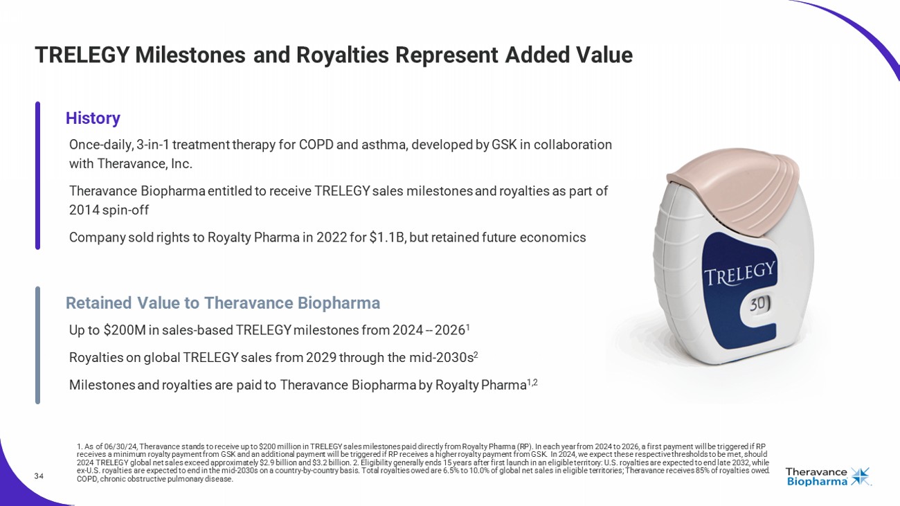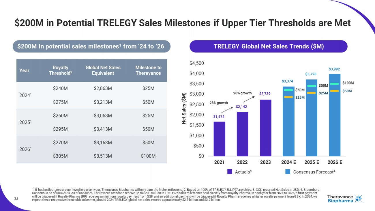 34 TRELEGY Milestones and Royalties Represent Added Value 1. As of 06/30/24, Theravance stands to receive up to $200 million in TRELEGY sales milestones paid directly from Royalty Pharma (RP). In each year from 20 24 to 2026, a first payment will be triggered if RP receives a minimum royalty payment from GSK and an additional payment will be triggered if RP receives a higher royalty payme nt from GSK. In 2024, we expect these respective thresholds to be met, should 2024 TRELEGY global net sales exceed approximately $2.9 billion and $3.2 billion. 2. Eligibility generally ends 15 years afte r f irst launch in an eligible territory: U.S. royalties are expected to end late 2032, while ex - U.S. royalties are expected to end in the mid - 2030s on a country - by - country basis. Total royalties owed are 6.5% to 10.0% of global net sales in eligible territories; Theravance receives 85% of royalties owed. COPD, chronic obstructive pulmonary disease. Retained Value to Theravance Biopharma Up to $200M in sales - based TRELEGY milestones from 2024 -- 2026 1 Royalties on global TRELEGY sales fro m 2029 through the mid - 2030s 2 Milestones and royalties are paid to Theravance Biopharma by Royalty Pharma 1,2 History O nce - daily, 3 - in - 1 treatment therapy for COPD and asthma, developed by GSK in collaboration with Theravance , Inc. Theravance Biopharma entitled to receive TRELEGY sales milestones and royalties as part of 2014 spin - off Company sold rights to Royalty Pharma in 2022 for $1.1B, but retained future economics
