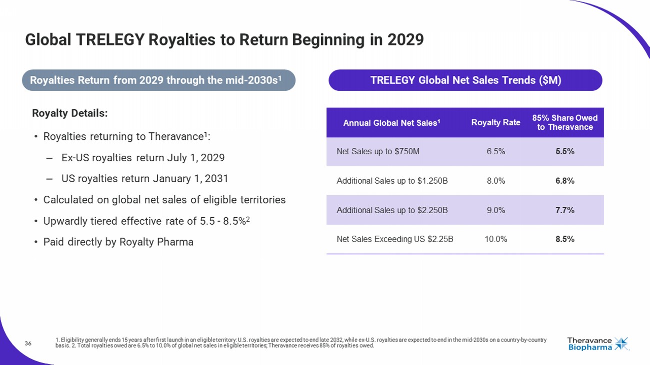 35 $200M in Potential TRELEGY Sales Milestones if Upper Tier Thresholds are Met 1. If both milestones are achieved in a given year, Theravance Biopharma will only earn the higher milestone. 2. Based on 100% of TRELEGY ELLIPTA royalties. 3. GSK - reported Net Sales in USD. 4. Bloomberg Consensus as of 08/02/24. As of 06/30/24, Theravance stands to receive up to $200 million in TRELEGY sales milestones paid directly from Royalty Pharma. In each year from 2024 to 2 026, a first payment will be triggered if Royalty Pharma (RP) receives a minimum royalty payment from GSK and an additional payment will be trigge red if Royalty Pharma receives a higher royalty payment from GSK. In 2024, we expect these respective thresholds to be met, should 2024 TRELEGY global net sales exceed approximately $2.9 billion and $3.2 bi llion. $0 $500 $1,000 $1,500 $2,000 $2,500 $3,000 $3,500 $4,000 $4,500 2021 2022 2023 2024 E 2025 E 2026 E Consensus Forecast 4 Actuals 3 Net Sales ($M) $50M $25M $50M $25M $100M $50M $1,674 $2,142 $2,739 $3,3 74 $3,7 28 $3,992 28% growth 28% growth Milestone to Theravance Global Net Sales Equivalent Royalty Threshold 2 Year $25M $2,863M $240M 2024 1 $50M $3,213M $275M $25M $3,063M $260M 2025 1 $50M $3,413M $295M $50M $3,163M $270M 2026 1 $100M $3,513M $305M TRELEGY Global Net Sales Trends ($M) $200M in potential sales milestones 1 from ‘24 to ‘26