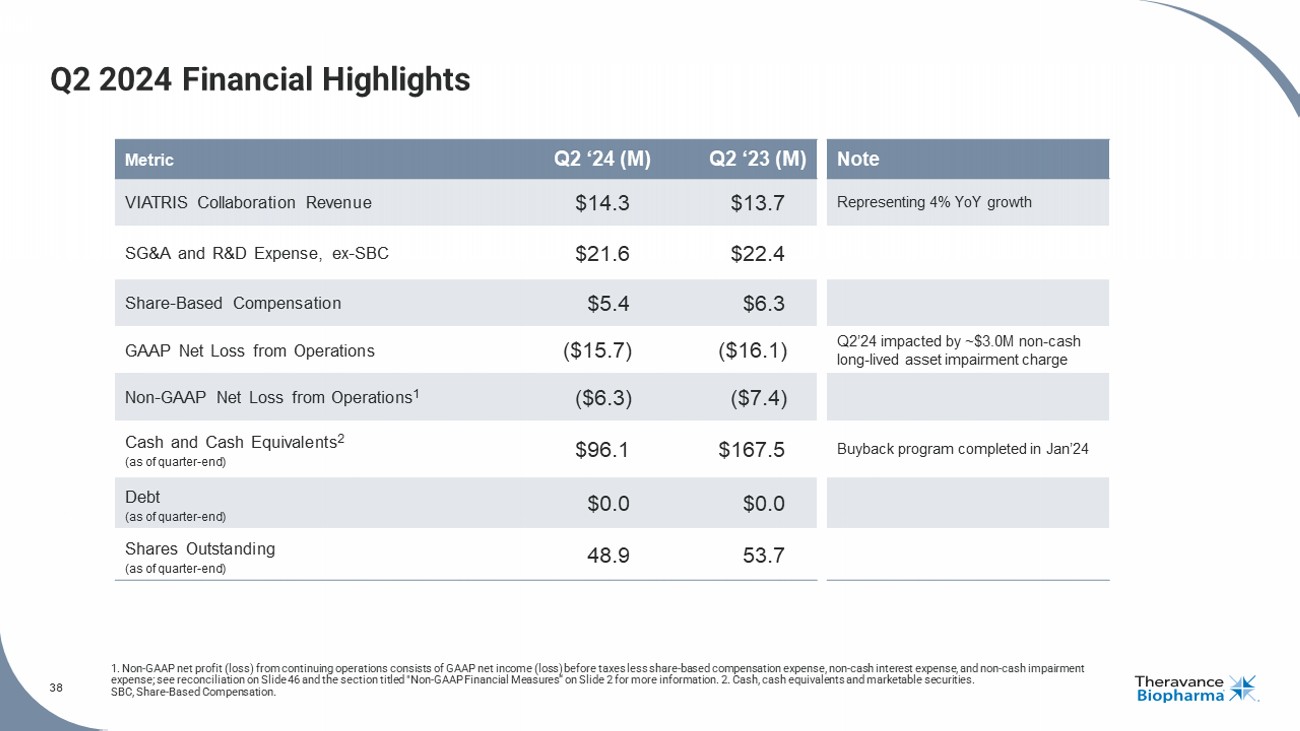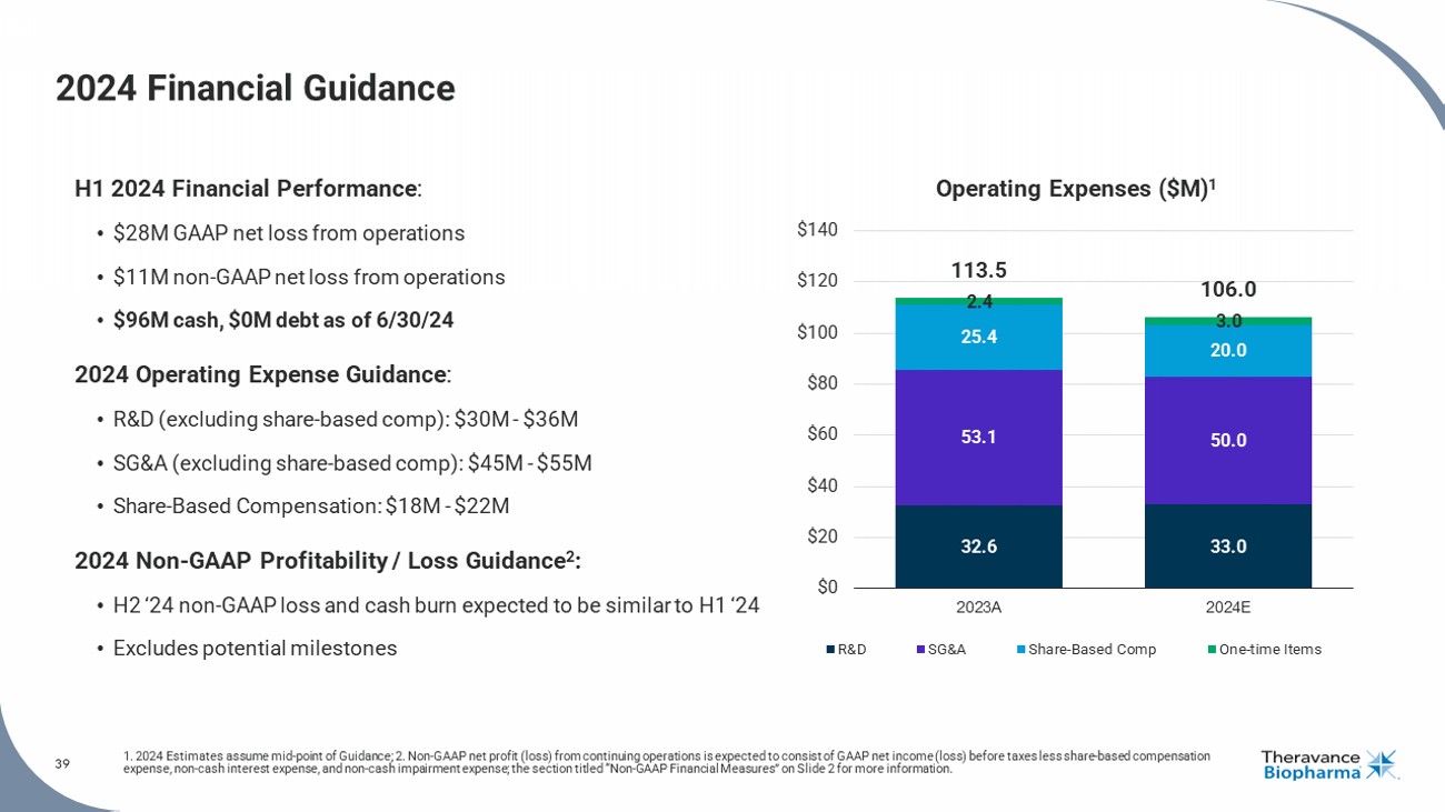 38 Q2 2024 Financial Highlights 1. Non - GAAP net profit (loss) from continuing operations consists of GAAP net income (loss) before taxes less share - based compen sation expense, non - cash interest expense, and non - cash impairment expense; see reconciliation on Slide 46 and the section titled "Non - GAAP Financial Measures“ on Slide 2 for more information. 2. Cash, cash equivalents and marketable securities. SBC, Share - Based Compensation. Note Q2 ‘23 (M) Q2 ‘24 (M) Metric Representing 4% YoY growth $13.7 $14.3 VIATRIS Collaboration Revenue $22.4 $21.6 SG&A and R&D Expense, ex - SBC $6.3 $5.4 Share - Based Compensation Q2’24 impacted by ~$3.0M non - cash long - lived asset impairment charge ($16.1) ($15.7) GAAP Net Loss from Operations ($7.4) ($6.3) Non - GAAP Net Loss from Operations 1 Buyback program completed in Jan’24 $167.5 $96.1 Cash and Cash Equivalents 2 (as of quarter - end) $0.0 $0.0 Debt (as of quarter - end) 53.7 48.9 Shares Outstanding (as of quarter - end)