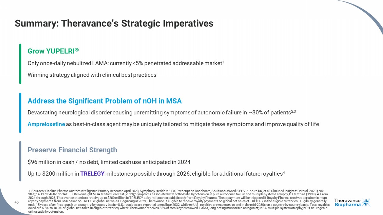 40 Preserve Financial Strength Address the Significant Problem of nOH in MSA Devastating neurological disorder causing unremitting symptoms of autonomic failure in ~80% of patients 2,3 Ampreloxetine as best - in - class agent may be uniquely tailored to mitigate these symptoms and improve quality of life $96 million in cash / no debt, limited cash use anticipated in 2024 Up to $200 million in TRELEGY milestones possible through 2026; eligible for additional future royalties 4 Summary: Theravance’s Strategic Imperatives 1. Sources: Citeline Pharma Custom Intelligence Primary Research April 2023, Symphony Health METYS Prescription Dashboard, SolutionsRx Med B FFS. 2. Kalra DK, et al. Clin Med Insights: Cardiol . 2020 (70% - 90%);14:1179546820953415. 3. Delveinsight MSA Market Forecast (2023); Symptoms associated with orthostatic hypotension in pure autonomic failure and multiple systems a tr ophy, CJ Mathias (1999). 4. From 2024 through 2026, Theravance stands to receive up to $200 million in TRELEGY sales milestones paid directly from Royalty Pha rma . These payment will be triggered if Royalty Pharma receives certain minimum royalty payments from GSK based on TRELEGY global net sales. Beginning in 2029, Theravance is eligible to receive royalty pay men ts on global net sales of TRELEGY in the eligible territories. Eligibility generally ends 15 years after first launch on a country - by - country basis -- U.S. royalties are expected to end late 2032, while ex - U.S. roy alties are expected to end in the mid - 2030s on a country - by - country basis. Total royalties owed are 6.5% to 10.0% of global net sales in eligible territories, where Theravance receives 85% of total royalties owed. LA MA, long - acting muscarinic antagonist; MSA, multiple system atrophy; nOH , neurogenic orthostatic hypotension. Grow YUPELRI  Only once - daily nebulized LAMA: currently <5% penetrated addressable market 1 Winning strategy aligned with clinical best practices