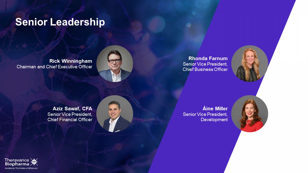 Rick Winningham Chairman and Chief Executive Officer Aziz Sawaf, CFA Senior Vice President, Chief Financial Officer Rhonda Farnum Senior Vice President, Chief Business Officer Áine Miller Senior Vice President, Development Senior Leadership