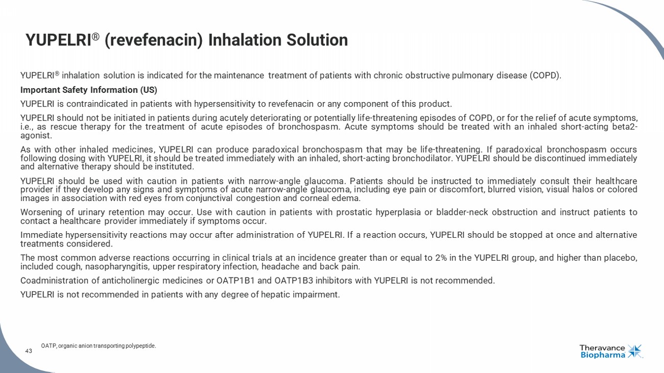 43 YUPELRI ® (revefenacin) Inhalation Solution YUPELRI ® inhalation solution is indicated for the maintenance treatment of patients with chronic obstructive pulmonary disease (COPD) . Important Safety Information (US) YUPELRI is contraindicated in patients with hypersensitivity to revefenacin or any component of this product . YUPELRI should not be initiated in patients during acutely deteriorating or potentially life - threatening episodes of COPD, or for the relief of acute symptoms, i . e . , as rescue therapy for the treatment of acute episodes of bronchospasm . Acute symptoms should be treated with an inhaled short - acting beta 2 - agonist . As with other inhaled medicines, YUPELRI can produce paradoxical bronchospasm that may be life - threatening . If paradoxical bronchospasm occurs following dosing with YUPELRI, it should be treated immediately with an inhaled, short - acting bronchodilator . YUPELRI should be discontinued immediately and alternative therapy should be instituted . YUPELRI should be used with caution in patients with narrow - angle glaucoma . Patients should be instructed to immediately consult their healthcare provider if they develop any signs and symptoms of acute narrow - angle glaucoma, including eye pain or discomfort, blurred vision, visual halos or colored images in association with red eyes from conjunctival congestion and corneal edema . Worsening of urinary retention may occur . Use with caution in patients with prostatic hyperplasia or bladder - neck obstruction and instruct patients to contact a healthcare provider immediately if symptoms occur . Immediate hypersensitivity reactions may occur after administration of YUPELRI . If a reaction occurs, YUPELRI should be stopped at once and alternative treatments considered . The most common adverse reactions occurring in clinical trials at an incidence greater than or equal to 2 % in the YUPELRI group, and higher than placebo, included cough, nasopharyngitis, upper respiratory infection, headache and back pain . Coadministration of anticholinergic medicines or OATP 1 B 1 and OATP 1 B 3 inhibitors with YUPELRI is not recommended . YUPELRI is not recommended in patients with any degree of hepatic impairment . OATP, organic anion transporting polypeptide. 43