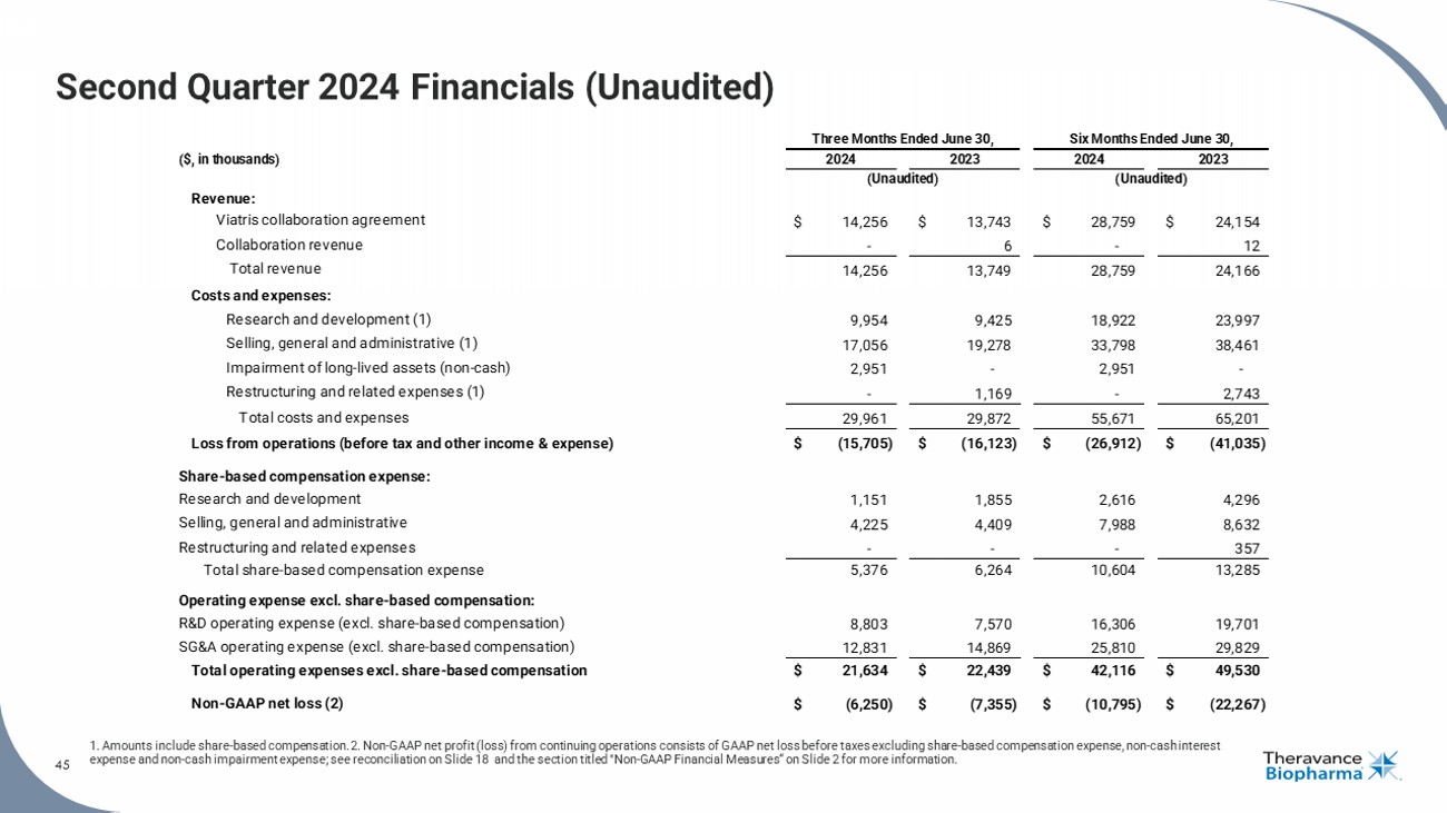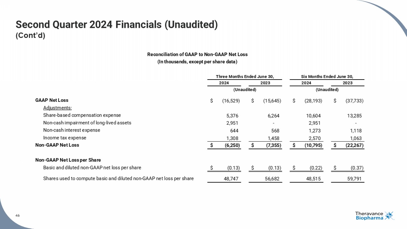 45 Second Quarter 2024 Financials (Unaudited) 1. Amounts include share - based compensation. 2. Non - GAAP net profit (loss) from continuing operations consists of GAAP net loss before taxes excluding share - based compensation expense, non - cash interest expense and non - cash impairment expense; see reconciliation on Slide 18 and the section titled "Non - GAAP Financial Measures“ on Slide 2 for more information. 45 ($, in thousands) Revenue: Viatris collaboration agreement $ 14,256 $ 13,743 $ 28,759 $ 24,154 Collaboration revenue - 6 - 12 Total revenue 14,256 13,749 28,759 24,166 Costs and expenses: Research and development (1) 9,954 9,425 18,922 23,997 Selling, general and administrative (1) 17,056 19,278 33,798 38,461 Impairment of long-lived assets (non-cash) 2,951 - 2,951 - Restructuring and related expenses (1) - 1,169 - 2,743 Total costs and expenses 29,961 29,872 55,671 65,201 Loss from operations (before tax and other income & expense) $ (15,705) $ (16,123) $ (26,912) $ (41,035) Share-based compensation expense: Research and development 1,151 1,855 2,616 4,296 Selling, general and administrative 4,225 4,409 7,988 8,632 Restructuring and related expenses - - - 357 Total share-based compensation expense 5,376 6,264 10,604 13,285 Operating expense excl. share-based compensation: R&D operating expense (excl. share-based compensation) 8,803 7,570 16,306 19,701 SG&A operating expense (excl. share-based compensation) 12,831 14,869 25,810 29,829 Total operating expenses excl. share-based compensation $ 21,634 $ 22,439 $ 42,116 $ 49,530 Non-GAAP net loss (2) $ (6,250) $ (7,355) $ (10,795) $ (22,267) Three Months Ended June 30, 2024 2023 (Unaudited) Six Months Ended June 30, 2024 2023 (Unaudited)