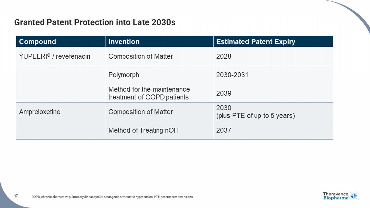 47 Granted Patent Protection into Late 2030s COPD, chronic obstructive pulmonary disease; nOH , neurogenic orthostatic hypotension; PTE, patent term extensions. Estimated Patent Expiry Invention Compound 2028 Composition of Matter YUPELRI ® / revefenacin 2030 - 2031 Polymorph 2039 Method for the maintenance treatment of COPD patients 2030 (plus PTE of up to 5 years) Composition of Matter Ampreloxetine 2037 Method of Treating nOH