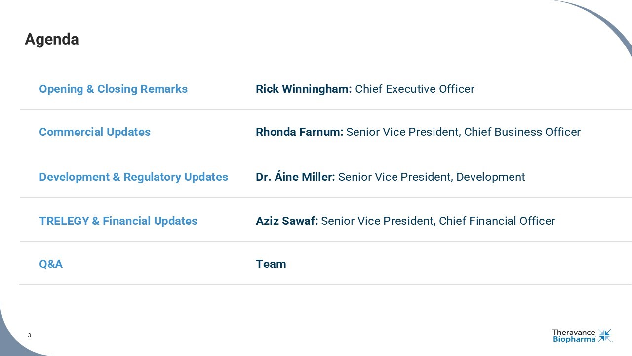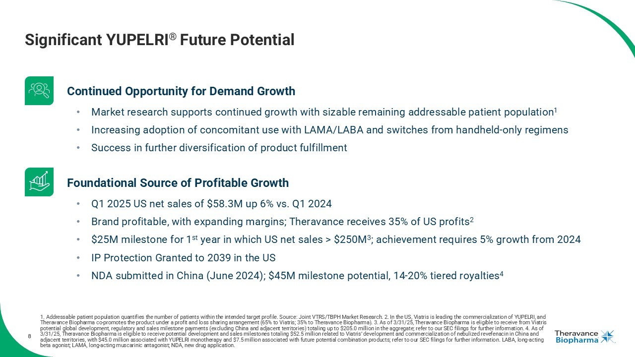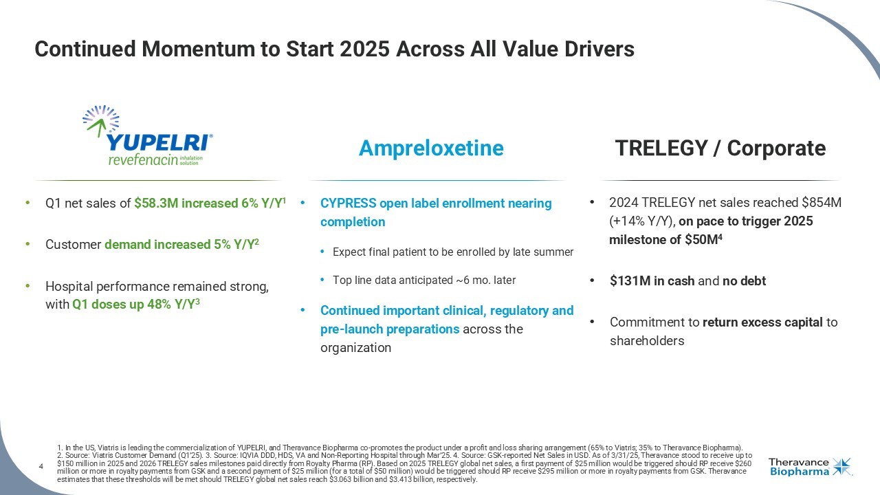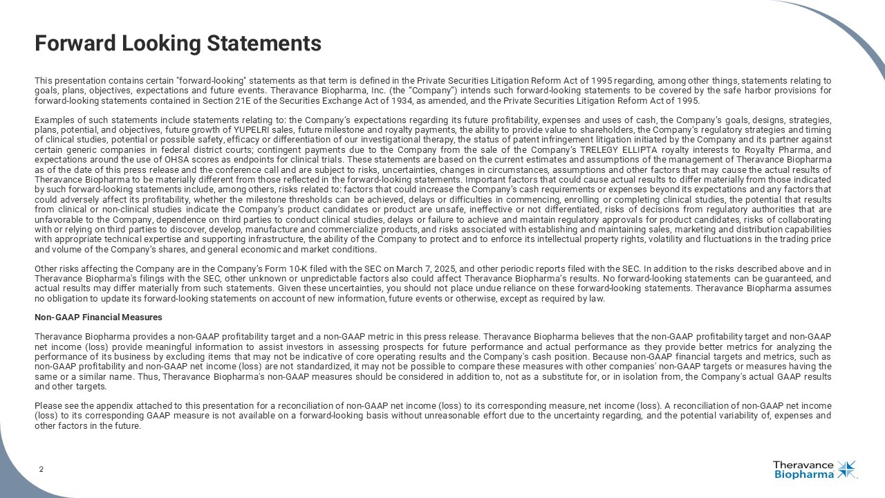 2 Forward Looking Statements This presentation contains certain "forward - looking" statements as that term is defined in the Private Securities Litigation Reform Act of 1995 regarding, among other things, statements relating to goals, plans, objectives, expectations and future events . Theravance Biopharma, Inc . (the “Company”) intends such forward - looking statements to be covered by the safe harbor provisions for forward - looking statements contained in Section 21 E of the Securities Exchange Act of 1934 , as amended, and the Private Securities Litigation Reform Act of 1995 . Examples of such statements include statements relating to : the Company’s expectations regarding its future profitability, expenses and uses of cash, the Company’s goals, designs, strategies, plans, potential, and objectives, future growth of YUPELRI sales, future milestone and royalty payments, the ability to provide value to shareholders, the Company’s regulatory strategies and timing of clinical studies, potential or possible safety, efficacy or differentiation of our investigational therapy, the status of patent infringement litigation initiated by the Company and its partner against certain generic companies in federal district courts ; contingent payments due to the Company from the sale of the Company’s TRELEGY ELLIPTA royalty interests to Royalty Pharma, and expectations around the use of OHSA scores as endpoints for clinical trials . These statements are based on the current estimates and assumptions of the management of Theravance Biopharma as of the date of this press release and the conference call and are subject to risks, uncertainties, changes in circumstances, assumptions and other factors that may cause the actual results of Theravance Biopharma to be materially different from those reflected in the forward - looking statements . Important factors that could cause actual results to differ materially from those indicated by such forward - looking statements include, among others, risks related to : factors that could increase the Company’s cash requirements or expenses beyond its expectations and any factors that could adversely affect its profitability, whether the milestone thresholds can be achieved, delays or difficulties in commencing, enrolling or completing clinical studies, the potential that results from clinical or non - clinical studies indicate the Company’s product candidates or product are unsafe, ineffective or not differentiated, risks of decisions from regulatory authorities that are unfavorable to the Company, dependence on third parties to conduct clinical studies, delays or failure to achieve and maintain regulatory approvals for product candidates, risks of collaborating with or relying on third parties to discover, develop, manufacture and commercialize products, and risks associated with establishing and maintaining sales, marketing and distribution capabilities with appropriate technical expertise and supporting infrastructure, the ability of the Company to protect and to enforce its intellectual property rights, volatility and fluctuations in the trading price and volume of the Company’s shares, and general economic and market conditions . Other risks affecting the Company are in the Company’s Form 10 - K filed with the SEC on March 7 , 2025 , and other periodic reports filed with the SEC . In addition to the risks described above and in Theravance Biopharma's filings with the SEC, other unknown or unpredictable factors also could affect Theravance Biopharma’s results . No forward - looking statements can be guaranteed, and actual results may differ materially from such statements . Given these uncertainties, you should not place undue reliance on these forward - looking statements . Theravance Biopharma assumes no obligation to update its forward - looking statements on account of new information, future events or otherwise, except as required by law . Non - GAAP Financial Measures Theravance Biopharma provides a non - GAAP profitability target and a non - GAAP metric in this press release . Theravance Biopharma believes that the non - GAAP profitability target and non - GAAP net income (loss) provide meaningful information to assist investors in assessing prospects for future performance and actual performance as they provide better metrics for analyzing the performance of its business by excluding items that may not be indicative of core operating results and the Company's cash position . Because non - GAAP financial targets and metrics, such as non - GAAP profitability and non - GAAP net income (loss) are not standardized, it may not be possible to compare these measures with other companies' non - GAAP targets or measures having the same or a similar name . Thus, Theravance Biopharma's non - GAAP measures should be considered in addition to, not as a substitute for, or in isolation from, the Company's actual GAAP results and other targets . Please see the appendix attached to this presentation for a reconciliation of non - GAAP net income (loss) to its corresponding measure, net income (loss) . A reconciliation of non - GAAP net income (loss) to its corresponding GAAP measure is not available on a forward - looking basis without unreasonable effort due to the uncertainty regarding, and the potential variability of, expenses and other factors in the future .