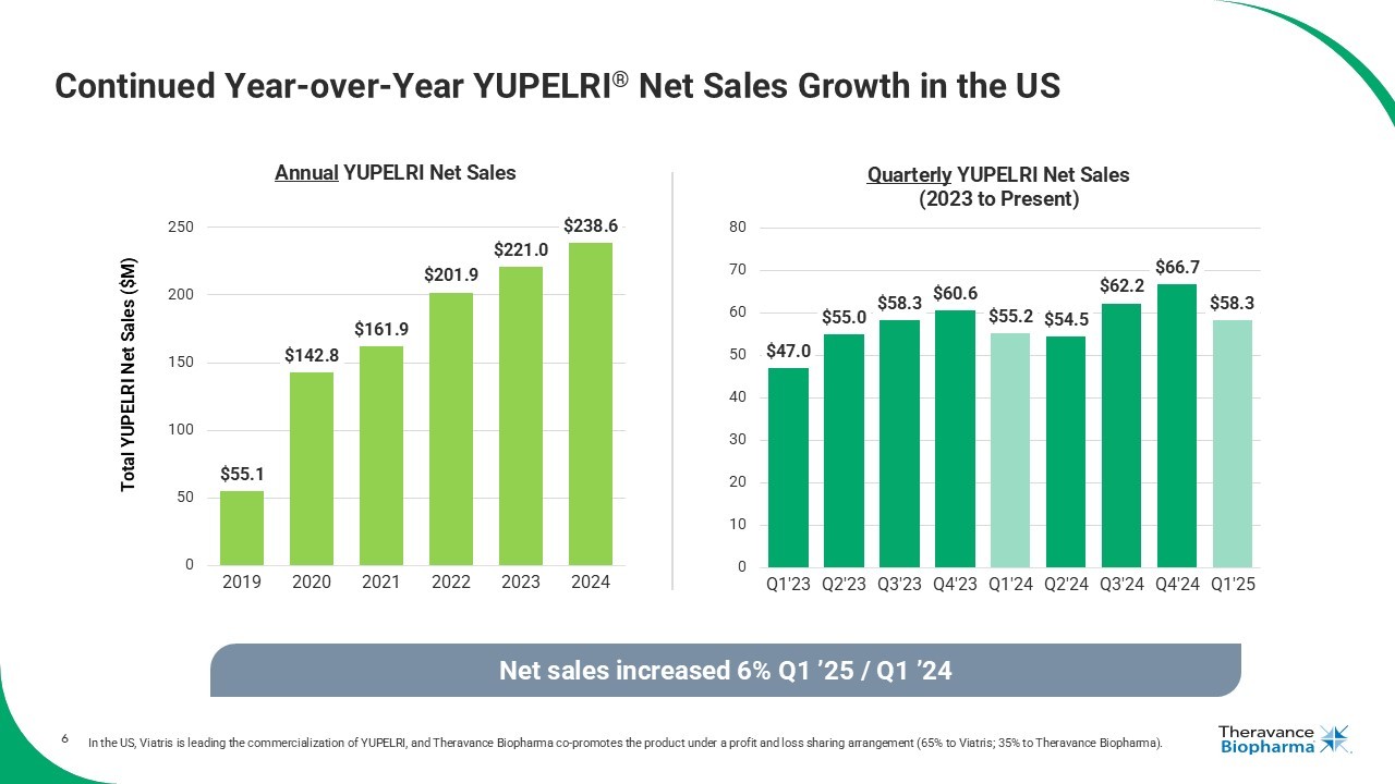 4 Continued Momentum to Start 2025 Across All Value Drivers 1. In the US, Viatris is leading the commercialization of YUPELRI, and Theravance Biopharma co - promotes the product under a prof it and loss sharing arrangement (65% to Viatris; 35% to Theravance Biopharma). 2. Source: Viatris Customer Demand (Q1’25) . 3 . Source: IQVIA DDD, HDS, VA and Non - Reporting Hospital through Mar’25. 4. Source: GSK - reported Net Sales in USD. As of 3/31/25, Theravance stood to receive up to $150 million in 2025 and 2026 TRELEGY sales milestones paid directly from Royalty Pharma (RP). Based on 2025 TRELEGY global n et sales, a first payment of $25 million would be triggered should RP receive $260 million or more in royalty payments from GSK and a second payment of $25 million (for a total of $50 million) would be trigge red should RP receive $295 million or more in royalty payments from GSK. Theravance estimates that these thresholds will be met should TRELEGY global net sales reach $3.063 billion and $3.413 billion, respecti vel y. 4 • Q1 net sales of $58.3M increased 6% Y/Y 1 • Customer demand increased 5% Y/Y 2 • H ospital performance remained strong, with Q1 doses up 48% Y/Y 3 • CYPRESS open label enrollment nearing completion • Expect final patient to be enrolled by late summer • Top line data anticipated ~6 mo. later • Continued important clinical, regulatory and pre - launch preparations across the organization Ampreloxetine TRELEGY / Corporate • 2024 TRELEGY net sales reached $854M (+14% Y/Y) , on pace to trigger 2025 milestone of $50M 4 • $131M in cash and no debt • Commitment to return excess capital to shareholders