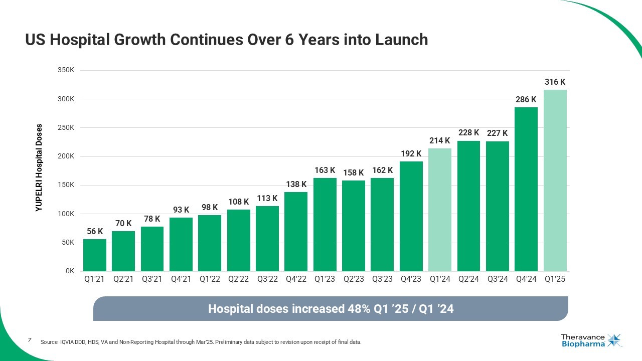 6 Continued Year - over - Year YUPELRI ® Net Sales Growth in the US In the US, Viatris is leading the commercialization of YUPELRI, and Theravance Biopharma co - promotes the product under a profit and loss sharing arrangement (65% to Viatris; 35% to Theravance Biopharma). $47.0 $55.0 $58.3 $60.6 $55.2 $54.5 $62.2 $66.7 $58.3 0 10 20 30 40 50 60 70 80 Q1'23 Q2'23 Q3'23 Q4'23 Q1'24 Q2'24 Q3'24 Q4'24 Q1'25 Net sales increased 6 % Q1 ’25 / Q1 ’24 Total YUPELRI Net Sales ($M) $55.1 $142.8 $161.9 $201.9 $221.0 $238.6 0 50 100 150 200 250 2019 2020 2021 2022 2023 2024 Quarterly YUPELRI Net Sales (2023 to Present) Annual YUPELRI Net Sales