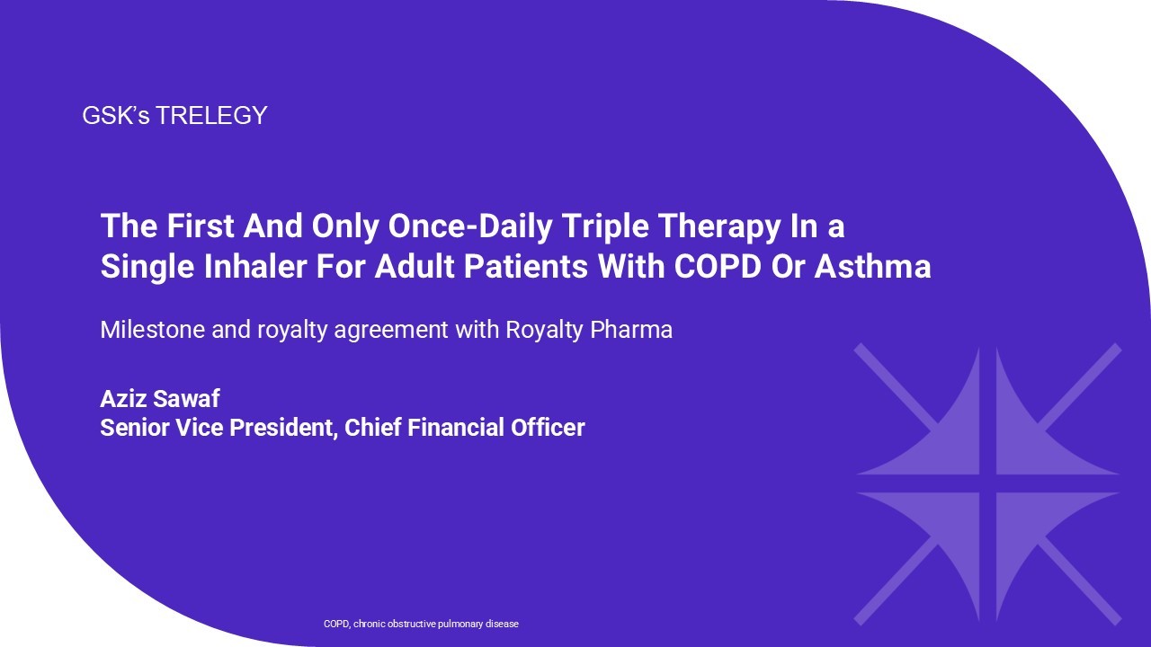 The First And Only Once - Daily Triple Therapy In a Single Inhaler For Adult Patients With COPD Or Asthma Milestone and royalty agreement with Royalty Pharma Aziz Sawaf Senior Vice President, Chief Financial Officer GSK’s TRELEGY COPD, chronic obstructive pulmonary disease
