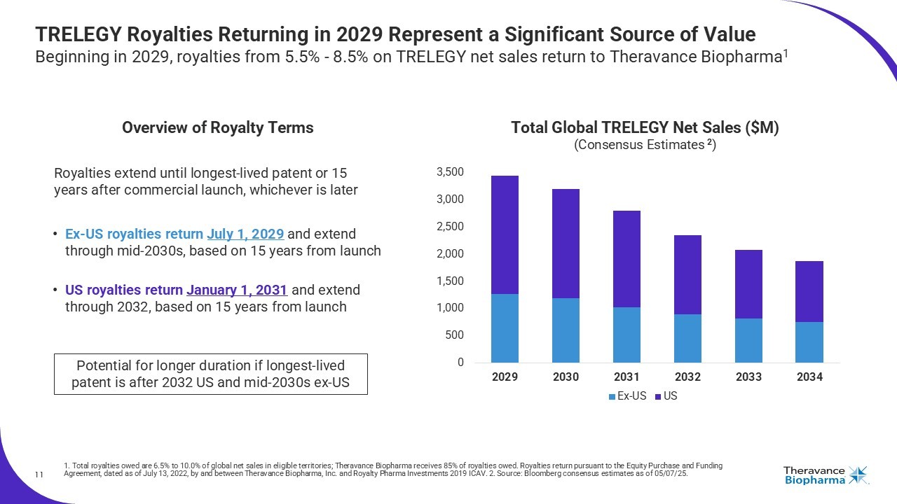10 Up to $150M in TRELEGY Sales Milestones in 2025 and 2026 Q1’25 Net Sales of $854M, up 14% YoY; on pace to trigger 2025 and 2026 milestones 1. If both milestones are achieved in a given year, Theravance Biopharma will only earn the higher milestone, payable by Roya lty Pharma (RP) pursuant to the Equity Purchase and Funding Agreement, dated as of July 13, 2022, by and between Theravance Biopharma, Inc. and Royalty Pharma Investments 2019 ICAV. 2. Based on 100% of TRE LEG Y ELLIPTA royalties. 3. GSK - reported Net Sales in USD. 4. Bloomberg Consensus as of 05/07/25. Milestone to Theravance Royalty Threshold 2 Global Net Sales Equivalent Year $25M $260M $3,063M 2025 1 $50M $295M $3,413M $50M $270M $3,163M 2026 1 $100M $305M $3,513M 2025 and 202 6 Sales Milestones 1 $0 $500 $1,000 $1,500 $2,000 $2,500 $3,000 $3,500 $4,000 $4,500 2021 2022 2023 2024 2025 E 2026 E Consensus Forecast 4 Actuals 3 Net Sales ($M) $50M $25M $100M $50M $1,674 $2,142 $2,739 $3,456 $3,9 26 $4,117 28% growth 28% growth Strong TRELEGY Global Net Sales Growth ($M) 26% growth