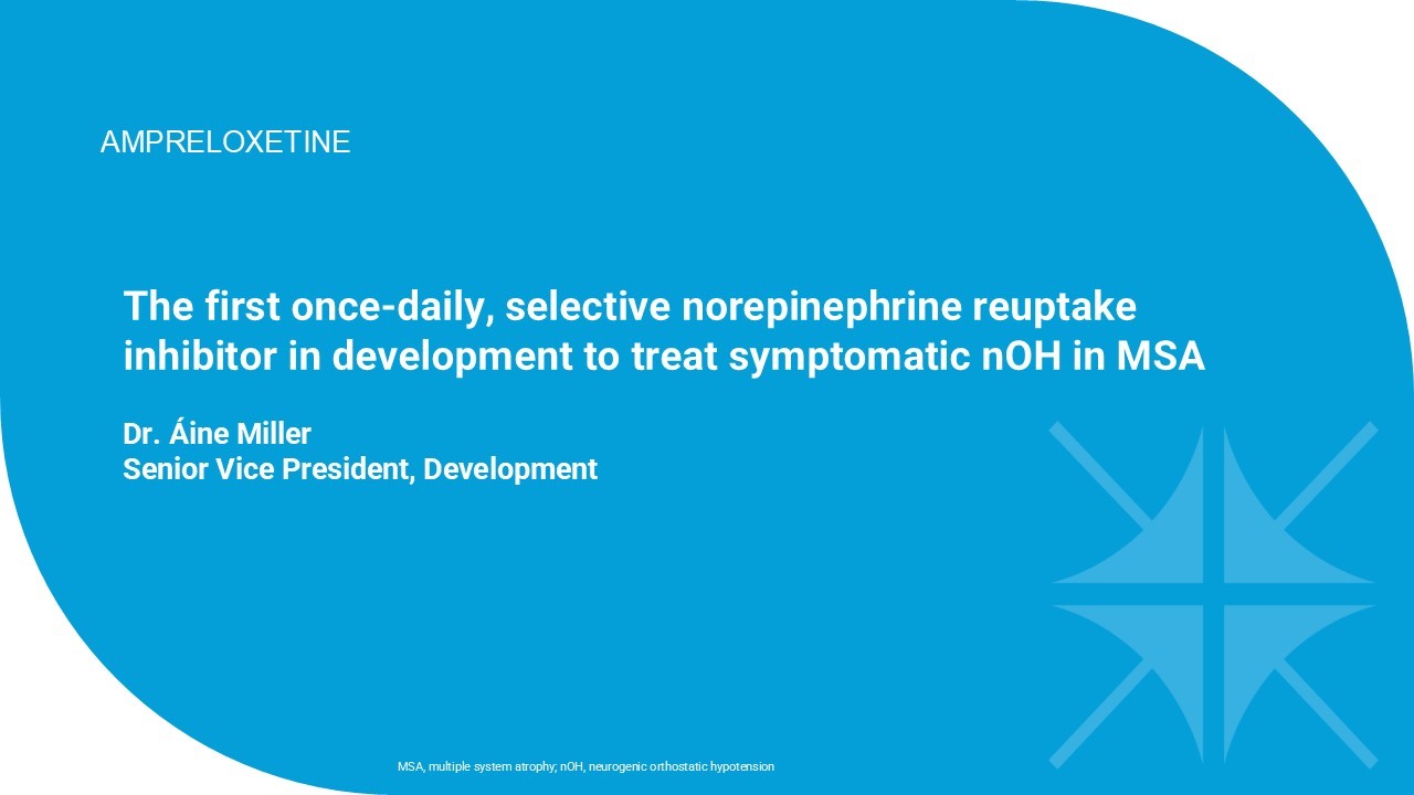 The first once - daily, selective norepinephrine reuptake inhibitor in development to treat symptomatic nOH in MSA Dr. Áine Miller Senior Vice President, Development MSA, multiple system atrophy; nOH, neurogenic orthostatic hypotension AMPRELOXETINE