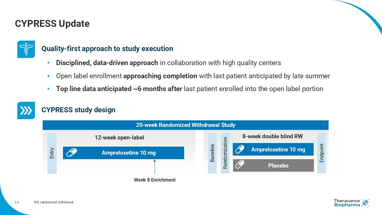 13 CYPRESS Update Quality - f irst a pproach to study execution • Disciplined, data - driven approach in collaboration with high quality centers • Open label enrollment approaching completion with last patient anticipated by late summer • Top line data anticipated ~6 months after last patient enrolled into the open label portion CYPRESS study d esign Entry Endpoint 8 - week double blind RW 12 - week open - label Baseline Randomization Ampreloxetine 10 mg Ampreloxetine 10 mg Placebo Week 8 Enrichment 20 - week Randomized Withdrawal Study RW, randomized withdrawal.