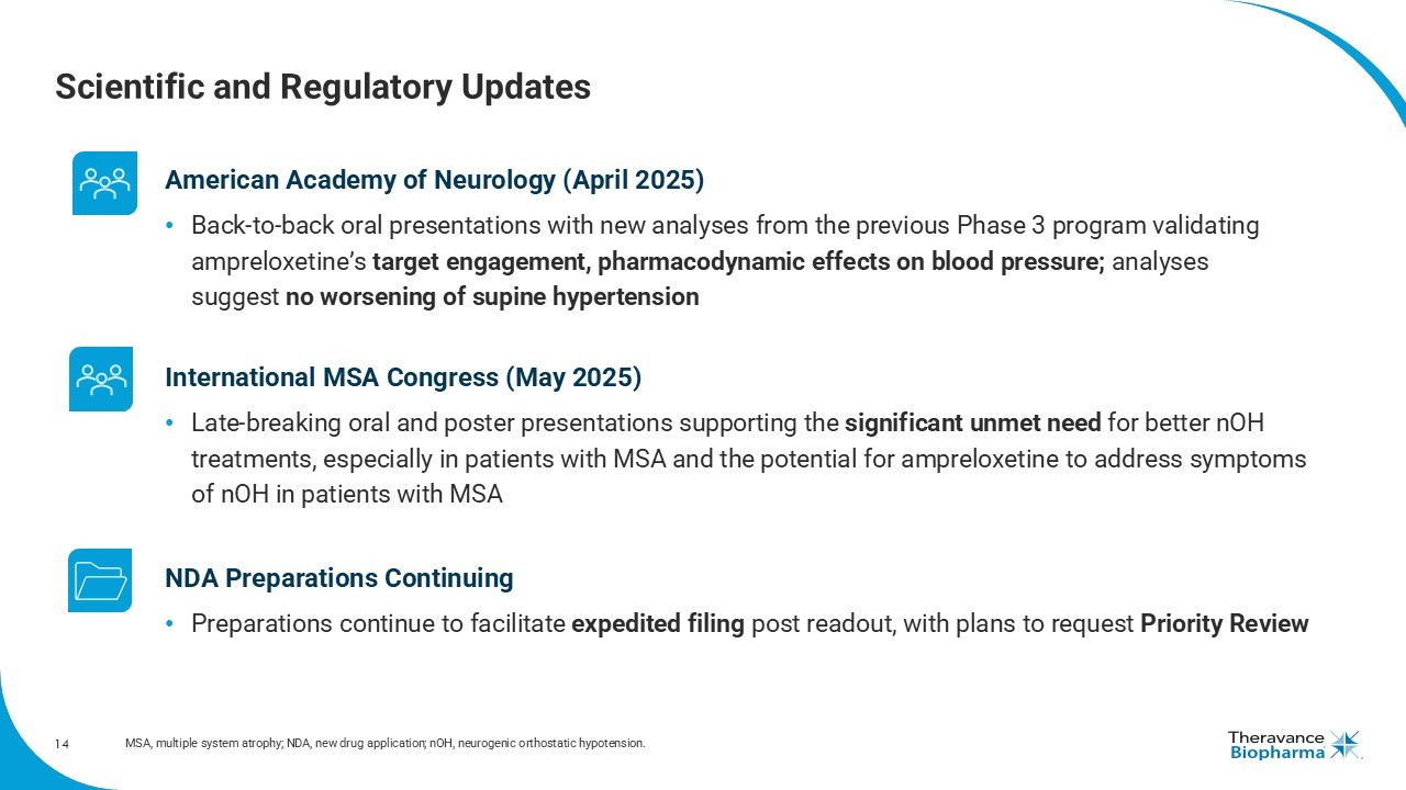 14 Scientific and Regulatory Updates International MSA Congress (May 2025) • Late - breaking oral and poster presentations supporting the significant unmet need for better nOH treatments, especially in patients with MSA and the potential for ampreloxetine to address symptoms of nOH in patients with MSA American Academy of Neurology (April 2025) • Back - to - back oral presentations with new analyses from the previous Phase 3 program validating ampreloxetine’s target engagement, pharmacodynamic effects on blood pressure; analyses suggest no worsening of supine hypertension NDA Preparations Continuing • Preparations continue to facilitate expedited filing post readout, with plans to request Priority Review MSA, multiple system atrophy; NDA, new d rug application ; nOH, neurogenic orthostatic hypotension.