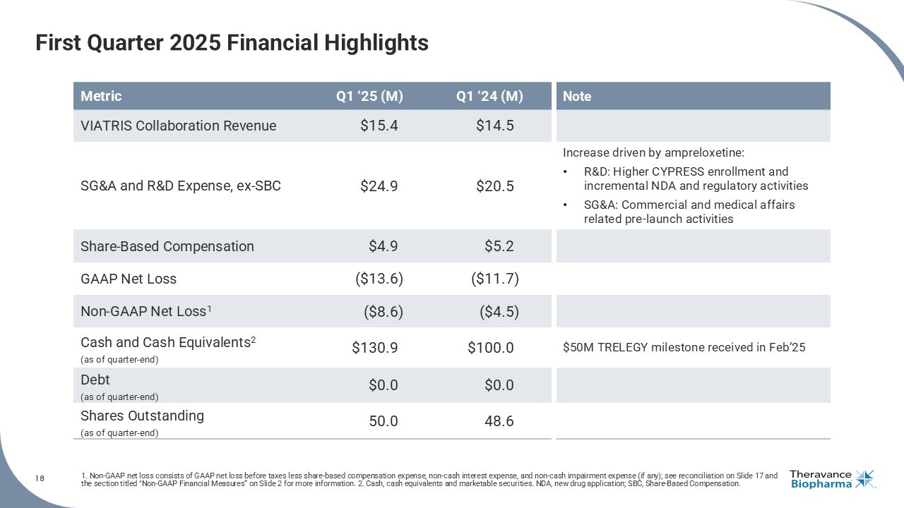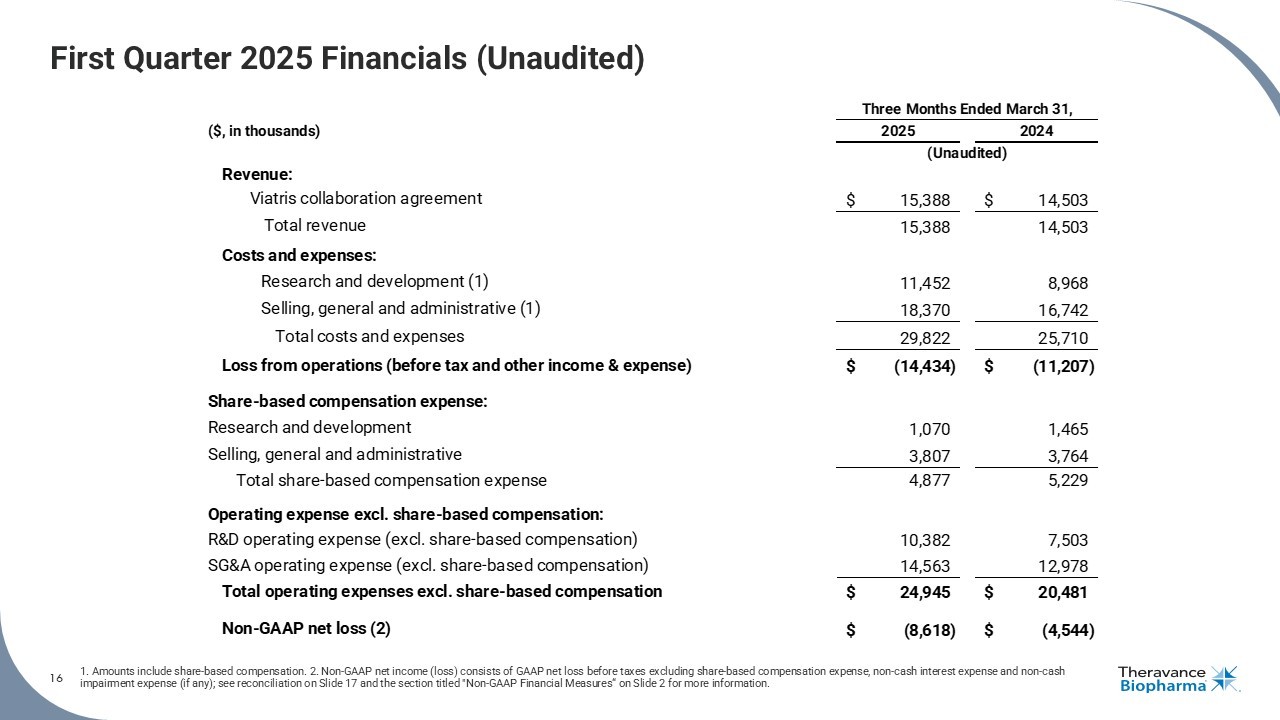 THERAVANCE BIOPHARMA ® , THERAVANCE ® , the Cross/Star logo and MEDICINES THAT MAKE A DIFFERENCE ® are registered trademarks of the Theravance Biopharma group of companies (in the U.S. and certain other countries). All third - party trademarks used herein are the property of their respective owners. © 2025 Theravance Biopharma. All rights reserved. Theravance Biopharma First Quarter 2025 Financial Results and Business Update May 8 , 2025