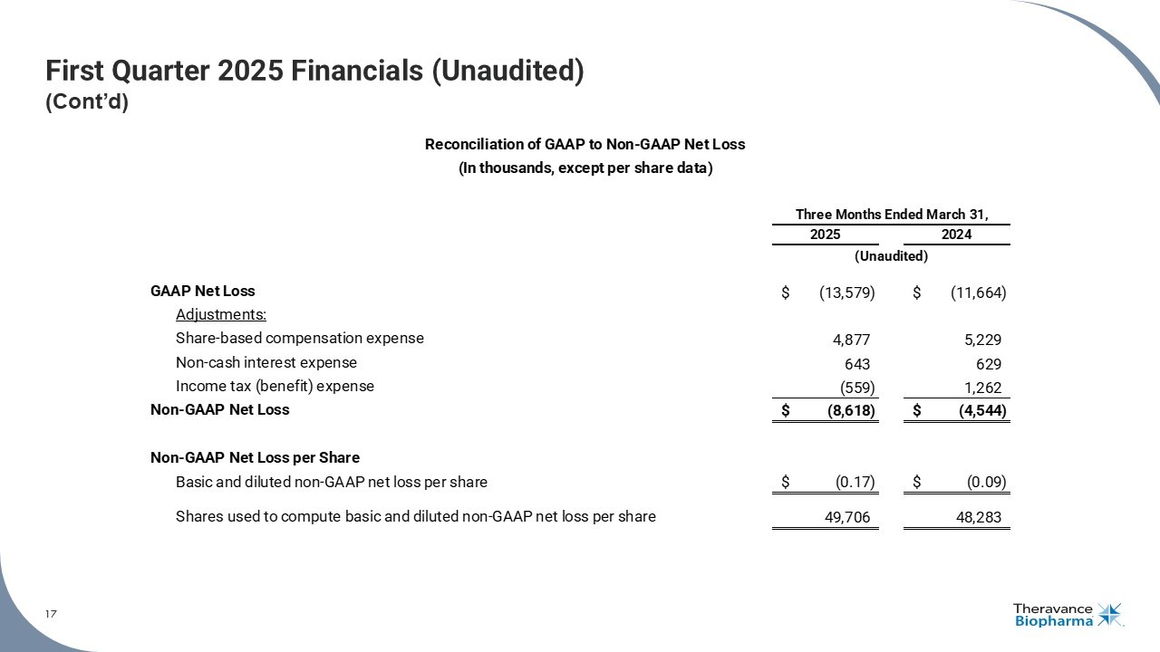 16 First Quarter 2025 Financials (Unaudited) 1. Amounts include share - based compensation. 2. Non - GAAP net income (loss) consists of GAAP net loss before taxes excluding share - based compensation expense, non - cash interest expense and non - cash impairment expense (if any); see reconciliation on Slide 17 and the section titled "Non - GAAP Financial Measures“ on Slide 2 for more information. 16 ($, in thousands) Revenue: Viatris collaboration agreement $ 15,388 $ 14,503 Total revenue 15,388 14,503 Costs and expenses: Research and development (1) 11,452 8,968 Selling, general and administrative (1) 18,370 16,742 Total costs and expenses 29,822 25,710 Loss from operations (before tax and other income & expense) $ (14,434) $ (11,207) Share-based compensation expense: Research and development 1,070 1,465 Selling, general and administrative 3,807 3,764 Total share-based compensation expense 4,877 5,229 Operating expense excl. share-based compensation: R&D operating expense (excl. share-based compensation) 10,382 7,503 SG&A operating expense (excl. share-based compensation) 14,563 12,978 Total operating expenses excl. share-based compensation $ 24,945 $ 20,481 Non-GAAP net loss (2) $ (8,618) $ (4,544) Three Months Ended March 31, 2025 2024 (Unaudited)