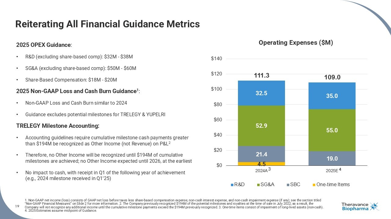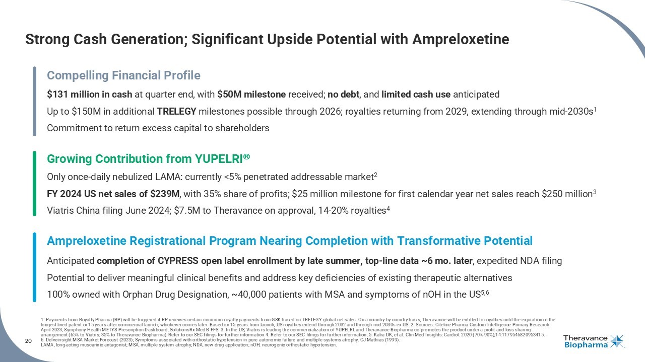 19 1. Non - GAAP net income (loss) consists of GAAP net loss before taxes less share - based compensation expense, non - cash interest ex pense, and non - cash impairment expense (if any); see the section titled "Non - GAAP Financial Measures“ on Slide 2 for more information. 2. The Company previously recognized $194M of the potential miles tones and royalties at the time of sale in July 2022; as a result, the Company will not recognize any additional income until the cumulative milestone payments exceed the $194M previously recogniz ed. 3. One - time items consist of impairment of long - lived assets (non - cash). 4. 2025 Estimates assume mid - point of Guidance. Reiterating All Financial Guidance Metrics 2025 OPEX Guidance : • R&D (excluding share - based comp): $32M - $38M • SG&A (excluding share - based comp): $50M - $60M • Share - Based Compensation: $18M - $20M 2025 Non - GAAP Loss and Cash Burn Guidance 1 : • Non - GAAP Loss and Cash Burn similar to 2024 • Guidance excludes potential milestones for TRELEGY & YUPELRI TRELEGY Milestone Accounting: • Accounting guidelines require cumulative milestone cash payments greater than $194M be recognized as Other Income (not Revenue) on P&L 2 • Therefore, no Other Income will be recognized until $194M of cumulative milestones are achieved; no Other Income expected until 2026, at the earliest • No impact to cash, with receipt in Q1 of the following year of achievement (e.g., 2024 milestone received in Q1’25) 4.5 21.4 19.0 52.9 55.0 32.5 35.0 111.3 109.0 $0 $20 $40 $60 $80 $100 $120 $140 2024A 2025E R&D SG&A SBC One-time Items 4 Operating Expenses ($M) 3