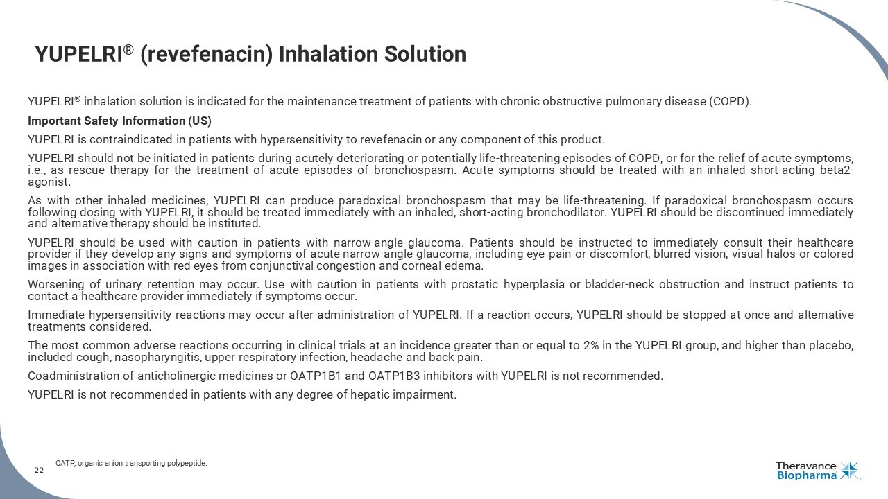 22 YUPELRI ® (revefenacin) Inhalation Solution YUPELRI ® inhalation solution is indicated for the maintenance treatment of patients with chronic obstructive pulmonary disease (COPD) . Important Safety Information (US) YUPELRI is contraindicated in patients with hypersensitivity to revefenacin or any component of this product . YUPELRI should not be initiated in patients during acutely deteriorating or potentially life - threatening episodes of COPD, or for the relief of acute symptoms, i . e . , as rescue therapy for the treatment of acute episodes of bronchospasm . Acute symptoms should be treated with an inhaled short - acting beta 2 - agonist . As with other inhaled medicines, YUPELRI can produce paradoxical bronchospasm that may be life - threatening . If paradoxical bronchospasm occurs following dosing with YUPELRI, it should be treated immediately with an inhaled, short - acting bronchodilator . YUPELRI should be discontinued immediately and alternative therapy should be instituted . YUPELRI should be used with caution in patients with narrow - angle glaucoma . Patients should be instructed to immediately consult their healthcare provider if they develop any signs and symptoms of acute narrow - angle glaucoma, including eye pain or discomfort, blurred vision, visual halos or colored images in association with red eyes from conjunctival congestion and corneal edema . Worsening of urinary retention may occur . Use with caution in patients with prostatic hyperplasia or bladder - neck obstruction and instruct patients to contact a healthcare provider immediately if symptoms occur . Immediate hypersensitivity reactions may occur after administration of YUPELRI . If a reaction occurs, YUPELRI should be stopped at once and alternative treatments considered . The most common adverse reactions occurring in clinical trials at an incidence greater than or equal to 2 % in the YUPELRI group, and higher than placebo, included cough, nasopharyngitis, upper respiratory infection, headache and back pain . Coadministration of anticholinergic medicines or OATP 1 B 1 and OATP 1 B 3 inhibitors with YUPELRI is not recommended . YUPELRI is not recommended in patients with any degree of hepatic impairment . OATP, organic anion transporting polypeptide. 22