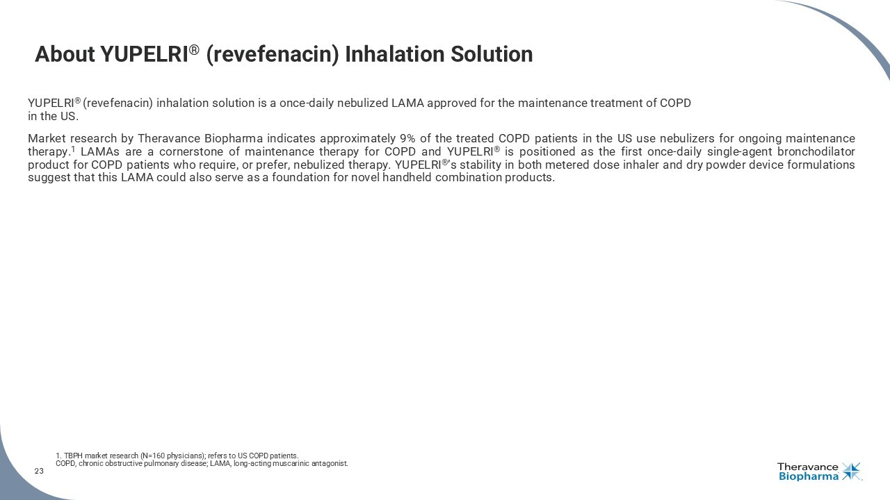 23 About YUPELRI ® (revefenacin) Inhalation Solution YUPELRI ® (revefenacin) inhalation solution is a once - daily nebulized LAMA approved for the maintenance treatment of COPD in the US . Market research by Theravance Biopharma indicates approximately 9 % of the treated COPD patients in the US use nebulizers for ongoing maintenance therapy . 1 LAMAs are a cornerstone of maintenance therapy for COPD and YUPELRI ® is positioned as the first once - daily single - agent bronchodilator product for COPD patients who require, or prefer, nebulized therapy . YUPELRI ® ’s stability in both metered dose inhaler and dry powder device formulations suggest that this LAMA could also serve as a foundation for novel handheld combination products . 1. TBPH market research (N=160 physicians); refers to US COPD patients. COPD, chronic obstructive pulmonary disease; LAMA, long - acting muscarinic antagonist. 23