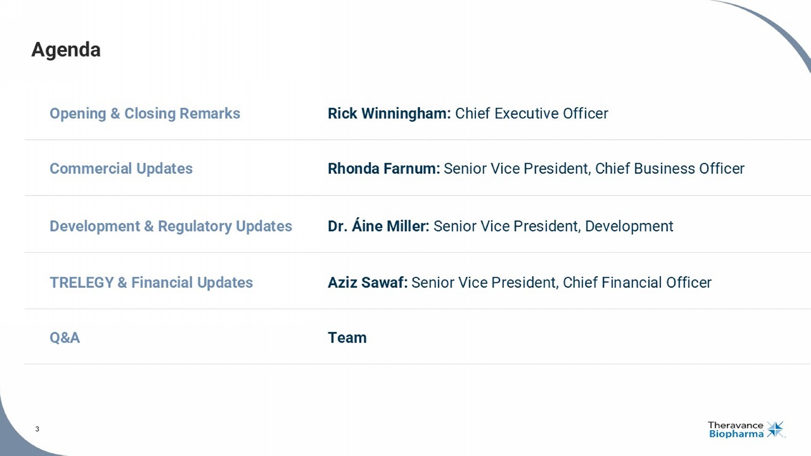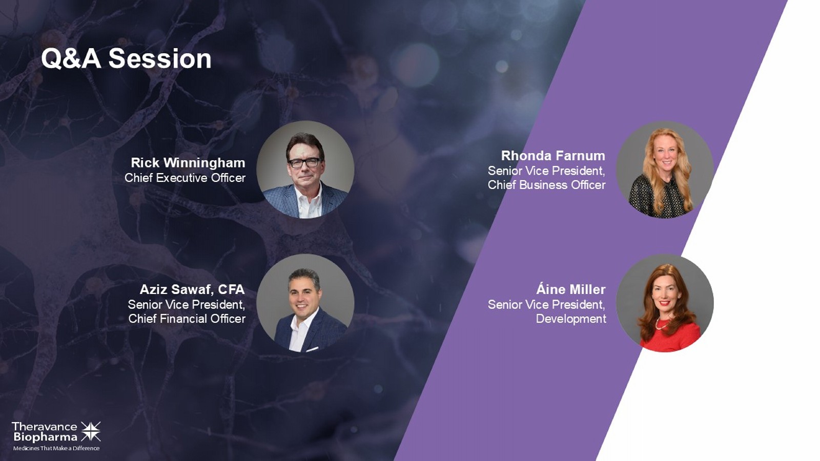 Rick Winningham Chief Executive Officer Aziz Sawaf, CFA Senior Vice President, Chief Financial Officer Rhonda Farnum Senior Vice President, Chief Business Officer Áine Miller Senior Vice President, Development Q&A Session