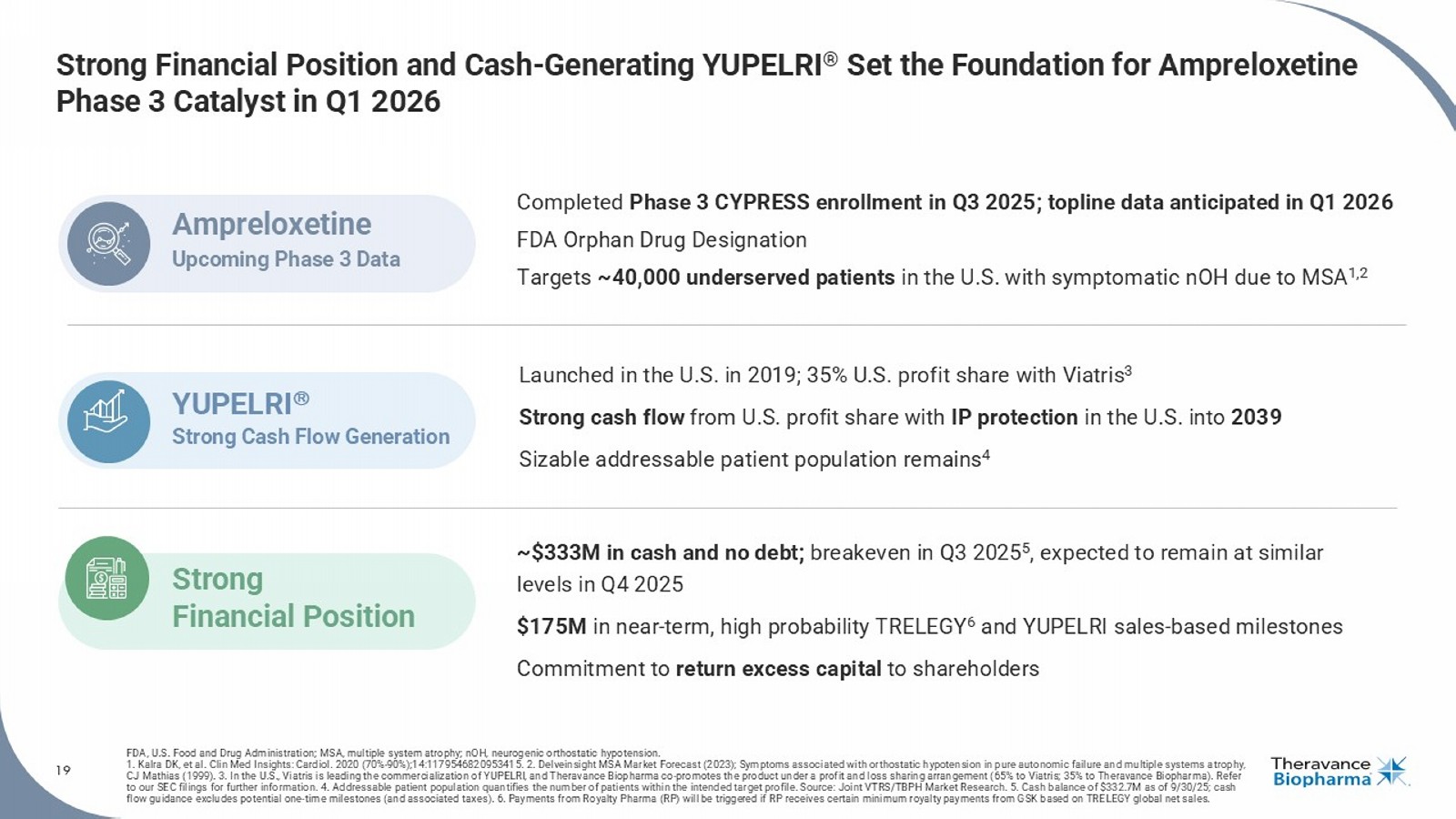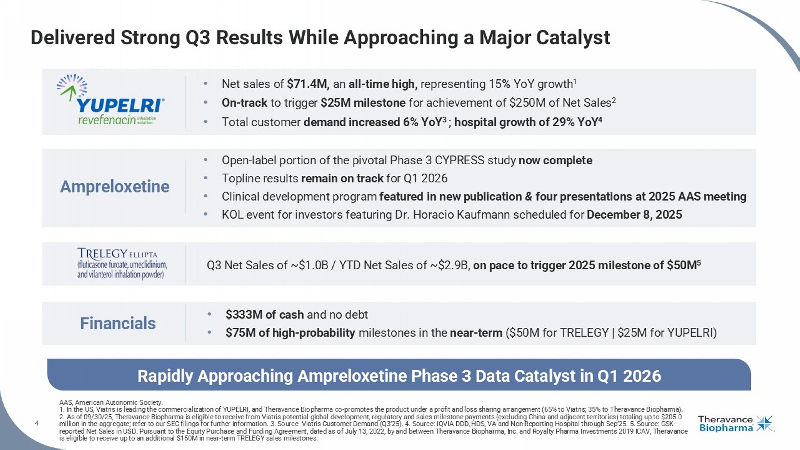 4 • $333M of cash and no debt • $75M of high - probability milestones in the near - term ($50M for TRELEGY | $25M for YUPELRI) • Net sales of $71.4M, an all - time high, representing 15 % YoY growth 1 • On - track to trigger $25M milestone for achievement of $250M of Net Sales 2 • Total c ustomer demand increased 6% YoY 3 ; hospital growth of 29% YoY 4 • Open - label portion of the pivotal Phase 3 CYPRESS study now complete • T opline results remain on track for Q1 2026 • Clinical development program featured in new publication & four presentations at 2025 AAS meeting • KOL event for investors featuring Dr. Horacio Kaufmann scheduled for December 8, 2025 Q3 Net Sales of ~$1.0B / YTD Net Sales of ~$2.9B, on pace to trigger 2025 milestone of $50M 5 Ampreloxetine Financials Rapidly Approaching Ampreloxetine Phase 3 Data Catalyst in Q1 2026 Delivered Strong Q3 Results While Approaching a Major Catalyst AAS, American Autonomic Society. 1. In the US, Viatris is leading the commercialization of YUPELRI, and Theravance Biopharma co - promotes the product under a prof it and loss sharing arrangement (65% to Viatris; 35% to Theravance Biopharma). 2. As of 09/30/25, Theravance Biopharma is eligible to receive from Viatris potential global development, regulatory and sale s m ilestone payments (excluding China and adjacent territories) totaling up to $205.0 million in the aggregate; refer to our SEC filings for further information. 3. Source: Viatris Customer Demand (Q3’25). 4. So urc e: IQVIA DDD, HDS, VA and Non - Reporting Hospital through Sep’25. 5. Source: GSK - reported Net Sales in USD. Pursuant to the Equity Purchase and Funding Agreement, dated as of July 13, 2022, by and between T her avance Biopharma, Inc. and Royalty Pharma Investments 2019 ICAV, Theravance is eligible to receive up to an additional $150M in near - term TRELEGY sales milestones. 4