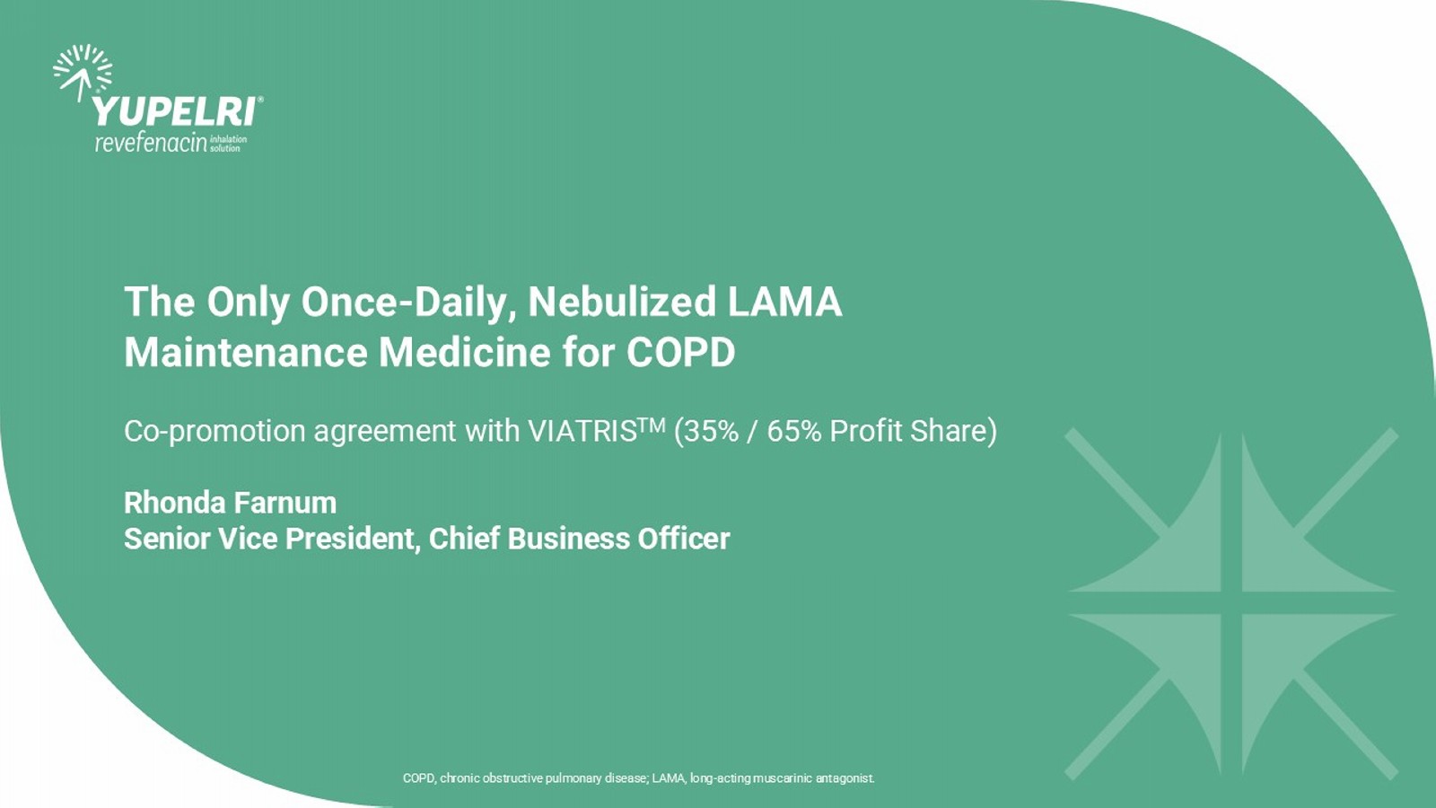 The Only Once - Daily, Nebulized LAMA Maintenance Medicine for COPD Co - promotion agreement with VIATRIS TM (35% / 65% Profit Share) Rhonda Farnum Senior Vice President, Chief Business Officer COPD, chronic obstructive pulmonary disease; LAMA, long - acting muscarinic antagonist.