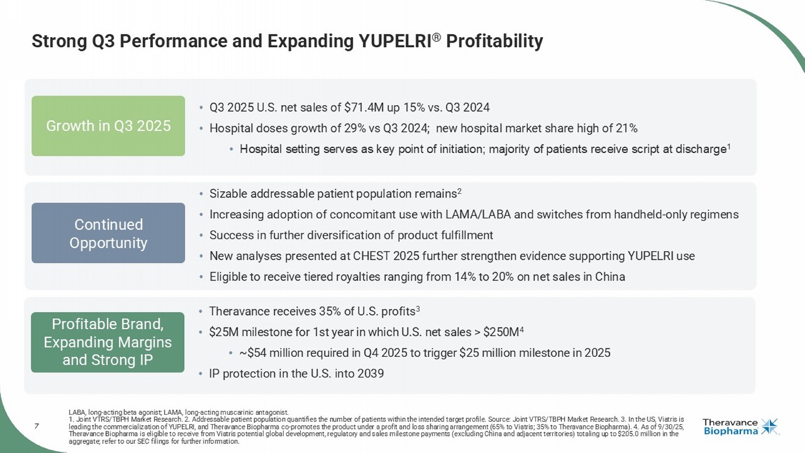 6 $60.6 $55.2 $54.5 $62.2 $66.7 $58.3 $66.3 $71.4 0 10 20 30 40 50 60 70 80 Q4'23 Q1'24 Q2'24 Q3'24 Q4'24 Q1'25 Q2'25 Q3'25 Quarterly YUPELRI Net Sales (Trailing Eight Quarters) Continued Year - over - Year YUPELRI ® Net Sales Growth in the U.S. In the US, Viatris is leading the commercialization of YUPELRI, and Theravance Biopharma co - promotes the product under a profit and loss sharing arrangement (65% to Viatris; 35% to Theravance Biopharma). Net sales increased 15% Q3 ’25 / Q3 ’24 Total YUPELRI Net Sales ($M) $55 $143 $162 $202 $221 $239 0 50 100 150 200 250 2019 2020 2021 2022 2023 2024 Annual YUPELRI Net Sales