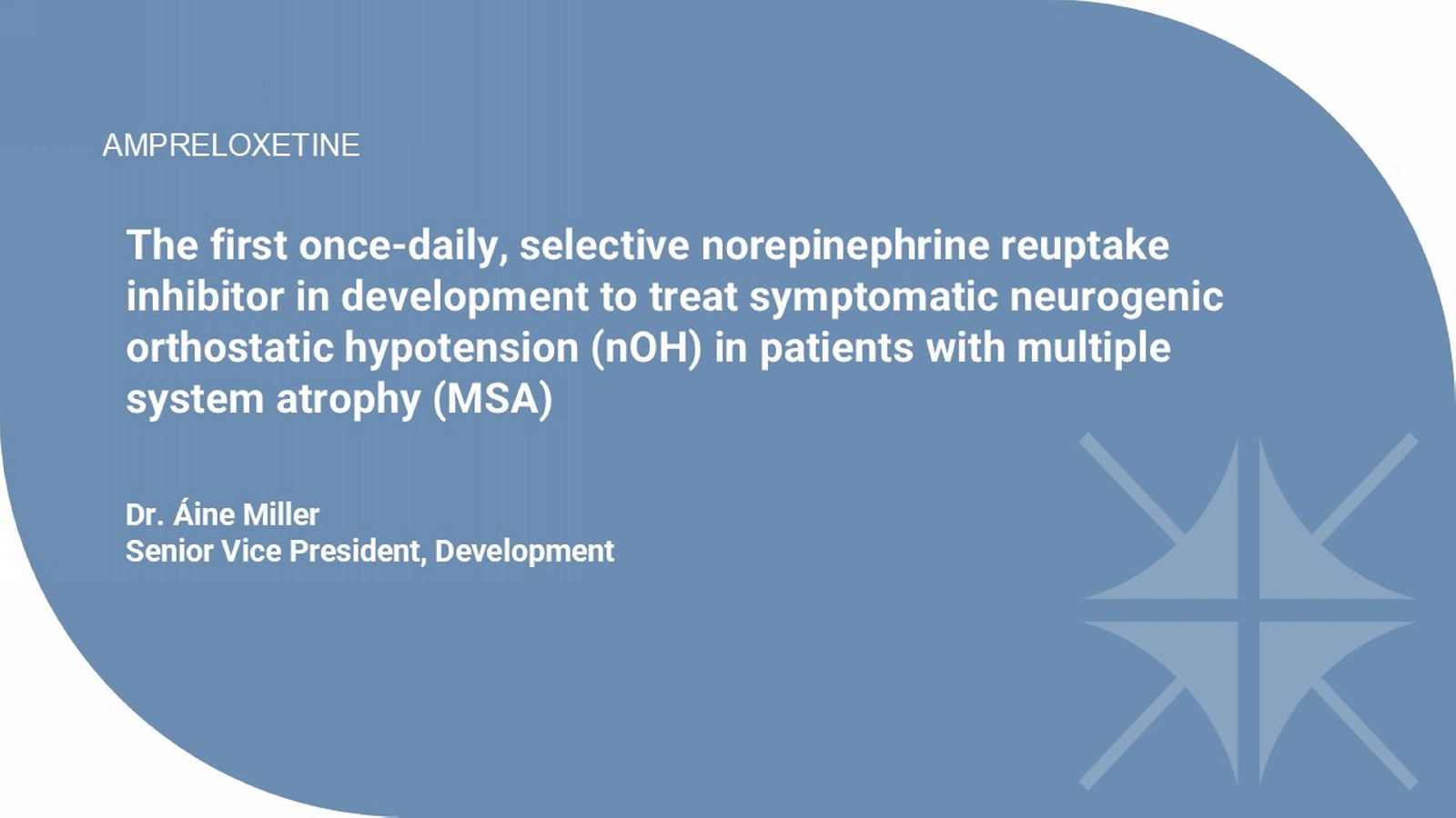 The first once - daily, selective norepinephrine reuptake inhibitor in development to treat symptomatic neurogenic orthostatic hypotension ( nOH ) in patients with multiple system atrophy (MSA) Dr. Áine Miller Senior Vice President, Development AMPRELOXETINE