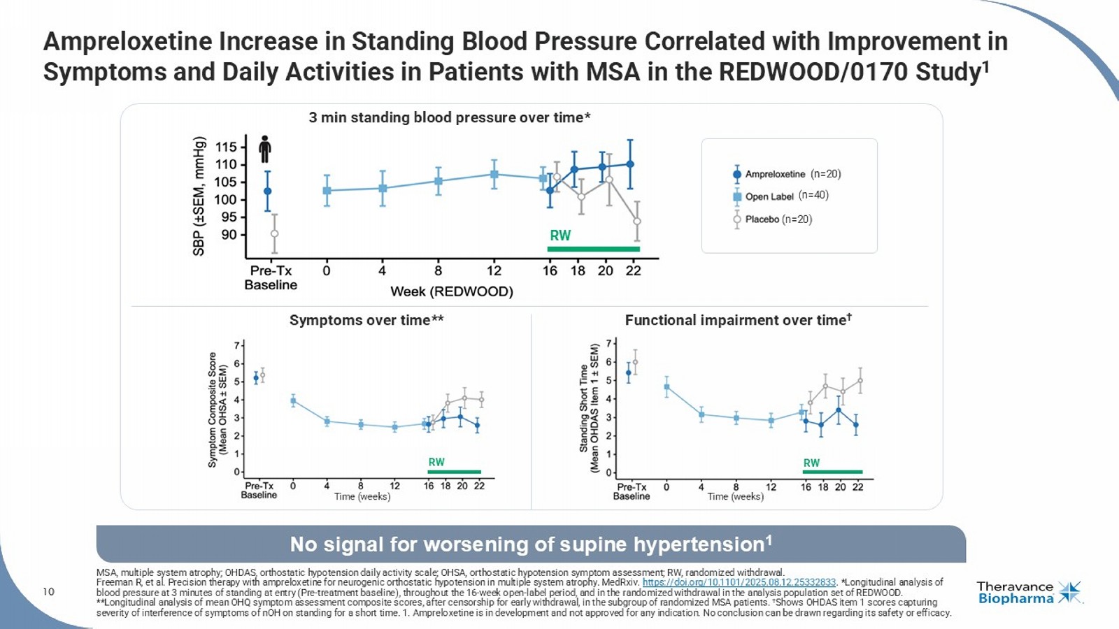 9 Recent Publications and Presentations Highlight Durable Symptom Benefit Observed in Previous REDWOOD/0170 Study in MSA Patients 1 AAS, American Autonomic Society; MSA, multiple system atrophy. 1. Ampreloxetine is in development and not approved for any indication. No conclusion can be drawn regarding its safety or efficacy. Publications AAS Presentations “ Precision therapy with ampreloxetine for neurogenic orthostatic hypotension in multiple system atrophy ” manuscript submitted, under review and pre - print posted on medRxiv • Highlights durable symptom and daily function improvement in MSA subgroup from the REDWOOD study 1 “ Establishing Minimally Clinically Important Differences for the Orthostatic Hypotension Questionnaire (OHQ) ” Kaufmann H, et al. manuscript published in Clinical Autonomic Research • Defines meaningful change thresholds, enhancing clinical interpretation One platform presentation and three poster presentations highlighting: • Results from the REDWOOD study in MSA subgroup • Rigorous methodologies to support enrollment and patient retention in the ongoing Phase 3 CYPRESS study