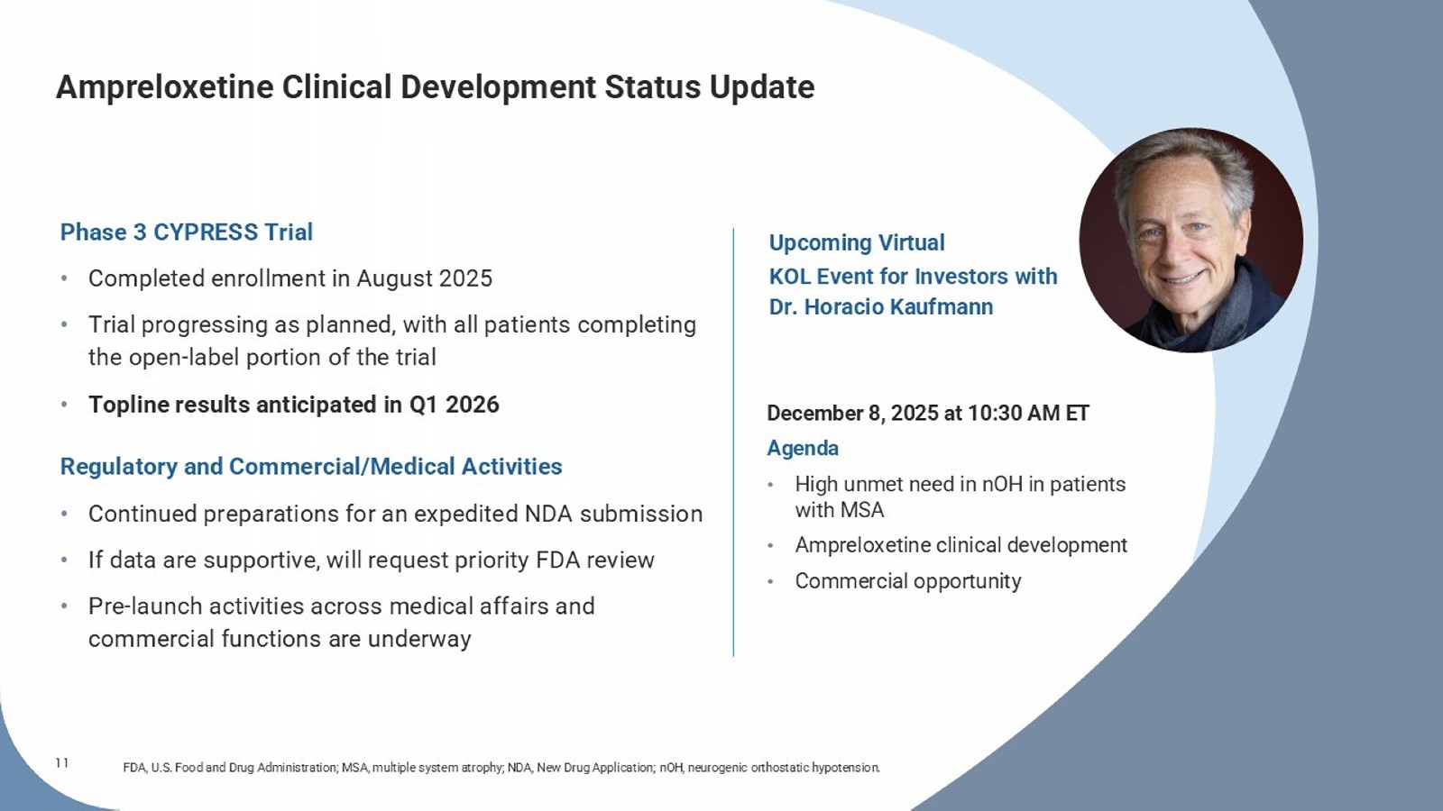 11 Ampreloxetine Clinical Development Status Update FDA, U.S. Food and Drug Administration; MSA, multiple system atrophy; NDA, New Drug Application; nOH , neurogenic orthostatic hypotension. December 8, 2025 at 10:30 AM ET Agenda • High unmet need in nOH in patients with MSA • Ampreloxetine clinical development • Commercial opportunity Phase 3 CYPRESS Trial • Completed enrollment in August 2025 • Trial progressing as planned, with all patients completing the open - label portion of the trial • Topline results anticipated in Q1 2026 Regulatory and Commercial/Medical Activities • Continued preparations for an expedited NDA submission • If data are supportive, will request priority FDA review • Pre - launch activities across medical affairs and commercial functions are underway Upcoming Virtual KOL Event for Investors with Dr. Horacio Kaufmann