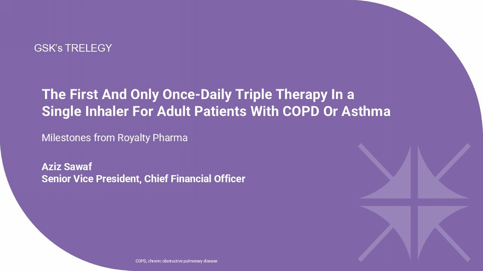 The First And Only Once - Daily Triple Therapy In a Single Inhaler For Adult Patients With COPD Or Asthma Milestones from Royalty Pharma Aziz Sawaf Senior Vice President, Chief Financial Officer GSK’s TRELEGY COPD, chronic obstructive pulmonary disease