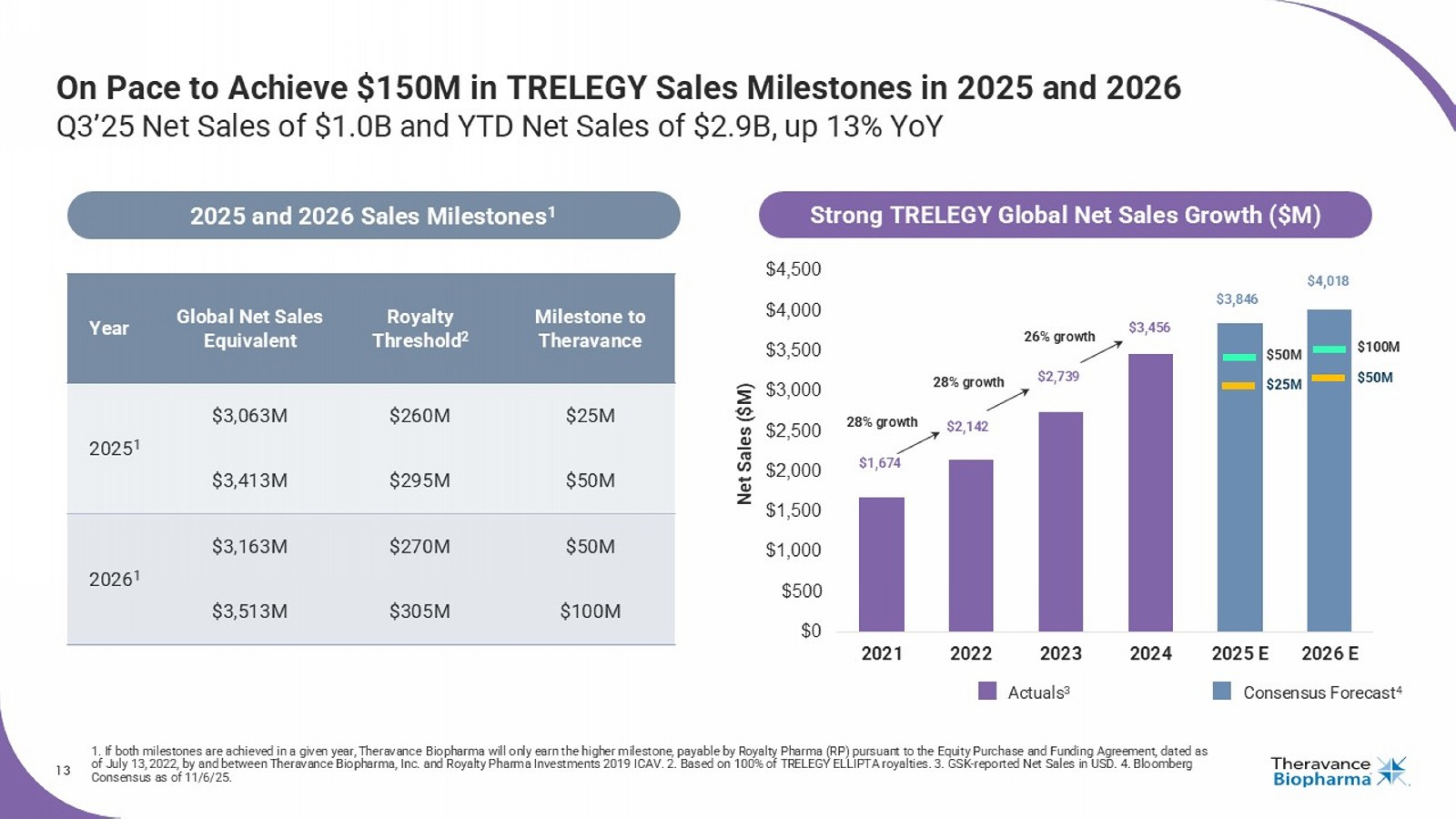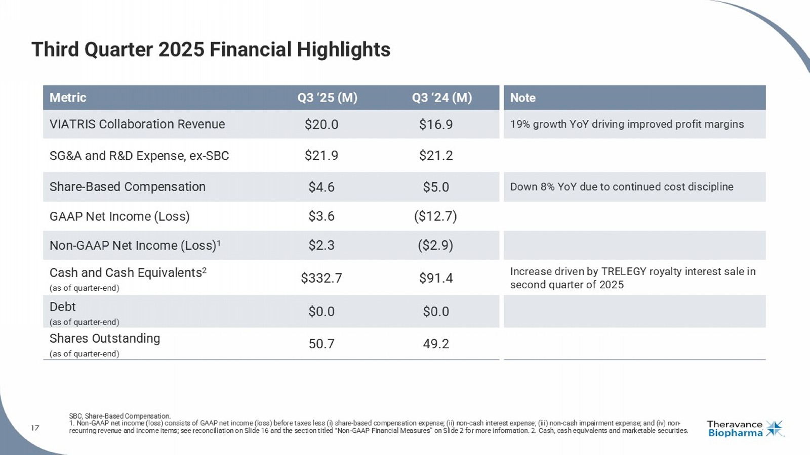 2 Forward Looking Statements This presentation contains certain "forward - looking" statements as that term is defined in the Private Securities Litigation Reform Act of 1995 regarding, among other things, statements relating to goals, plans, objectives, expectations and future events . Theravance Biopharma, Inc . (the “Company”) intends such forward - looking statements to be covered by the safe harbor provisions for forward - looking statements contained in Section 21 E of the Securities Exchange Act of 1934 , as amended, and the Private Securities Litigation Reform Act of 1995 . Examples of such statements include statements relating to : the Company’s expectations regarding its future profitability, expenses and uses of cash, the Company’s goals, designs, strategies, plans and objectives, future growth of YUPELRI sales, the ability to provide value to shareholders, the Company’s regulatory strategies and timing of clinical studies, possible safety, efficacy or differentiation of our investigational therapy, commercial potential and market opportunity of our investigational therapy, the status of patent infringement litigation initiated by the Company and its partner against certain generic companies in federal district courts ; contingent Trelegy sales - based milestones payable by Royalty Pharma, and expectations around the use of OHSA scores as endpoints for clinical trials . These statements are based on the current estimates and assumptions of the management of Theravance Biopharma as of the date of this presentation and the conference call and are subject to risks, uncertainties, changes in circumstances, assumptions and other factors that may cause the actual results of Theravance Biopharma to be materially different from those reflected in the forward - looking statements . Important factors that could cause actual results to differ materially from those indicated by such forward - looking statements include, among others, risks related to : factors that could increase the Company’s cash requirements or expenses beyond its expectations and any factors that could adversely affect its profitability, whether the milestone thresholds can be achieved, delays or difficulties in commencing, enrolling or completing clinical studies, the potential that results from clinical or non - clinical studies indicate the Company’s product candidates or product are unsafe, ineffective or not differentiated, risks of decisions from regulatory authorities that are unfavorable to the Company, dependence on third parties to conduct clinical studies, delays or failure to achieve and maintain regulatory approvals for product candidates, risks of collaborating with or relying on third parties to discover, develop, manufacture and commercialize products, and risks associated with establishing and maintaining sales, marketing and distribution capabilities with appropriate technical expertise and supporting infrastructure, the ability of the Company to protect and to enforce its intellectual property rights, volatility and fluctuations in the trading price and volume of the Company’s shares, and general economic and market conditions . Other risks affecting the Company are in the Company’s Form 10 - Q filed with the SEC on August 13 , 2025 , and other periodic reports filed with the SEC . In addition to the risks described above and in Theravance Biopharma's filings with the SEC, other unknown or unpredictable factors also could affect Theravance Biopharma’s results . No forward - looking statements can be guaranteed, and actual results may differ materially from such statements . Given these uncertainties, you should not place undue reliance on these forward - looking statements . Theravance Biopharma assumes no obligation to update its forward - looking statements on account of new information, future events or otherwise, except as required by law . Non - GAAP Financial Measures Theravance Biopharma provides a non - GAAP profitability target and a non - GAAP metric in this presentation . Theravance Biopharma believes that the non - GAAP profitability target and non - GAAP net income (loss) provide meaningful information to assist investors in assessing prospects for future performance and actual performance as they provide better metrics for analyzing the performance of its business by excluding items that may not be indicative of core operating results and the Company's cash position . Because non - GAAP financial targets and metrics, such as non - GAAP profitability and non - GAAP net income (loss) are not standardized, it may not be possible to compare these measures with other companies' non - GAAP targets or measures having the same or a similar name . Thus, Theravance Biopharma's non - GAAP measures should be considered in addition to, not as a substitute for, or in isolation from, the Company's actual GAAP results and other targets . This presentation contains a reconciliation of non - GAAP net income (loss) to its corresponding measure, net income (loss) . A reconciliation of non - GAAP net income (loss) to its corresponding GAAP measure is not available on a forward - looking basis without unreasonable effort due to the uncertainty regarding, and the potential variability of, expenses and other factors in the future .