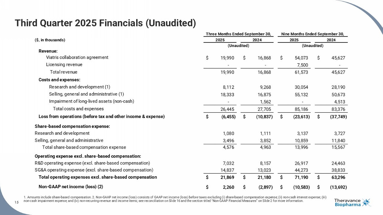 15 Third Quarter 2025 Financials (Unaudited) 1. Amounts include share - based compensation. 2. Non - GAAP net income (loss) consists of GAAP net income (loss) before taxes exclu ding (i) share - based compensation expense; (ii) non - cash interest expense; (iii) non - cash impairment expense; and (iv) non - recurring revenue and income items; see reconciliation on Slide 16 and the section tit led "Non - GAAP Financial Measures“ on Slide 2 for more information. 15 ($, in thousands) Revenue: Viatris collaboration agreement $ 19,990 $ 16,868 $ 54,073 $ 45,627 Licensing revenue - - 7,500 - Total revenue 19,990 16,868 61,573 45,627 Costs and expenses: Research and development (1) 8,112 9,268 30,054 28,190 Selling, general and administrative (1) 18,333 16,875 55,132 50,673 Impairment of long-lived assets (non-cash) - 1,562 - 4,513 Total costs and expenses 26,445 27,705 85,186 83,376 Loss from operations (before tax and other income & expense) $ (6,455) $ (10,837) $ (23,613) $ (37,749) Share-based compensation expense: Research and development 1,080 1,111 3,137 3,727 Selling, general and administrative 3,496 3,852 10,859 11,840 Total share-based compensation expense 4,576 4,963 13,996 15,567 Operating expense excl. share-based compensation: R&D operating expense (excl. share-based compensation) 7,032 8,157 26,917 24,463 SG&A operating expense (excl. share-based compensation) 14,837 13,023 44,273 38,833 Total operating expenses excl. share-based compensation $ 21,869 $ 21,180 $ 71,190 $ 63,296 Non-GAAP net income (loss) (2) $ 2,260 $ (2,897) $ (10,583) $ (13,692) Three Months Ended September 30, 2025 2024 (Unaudited) Nine Months Ended September 30, 2025 2024 (Unaudited)