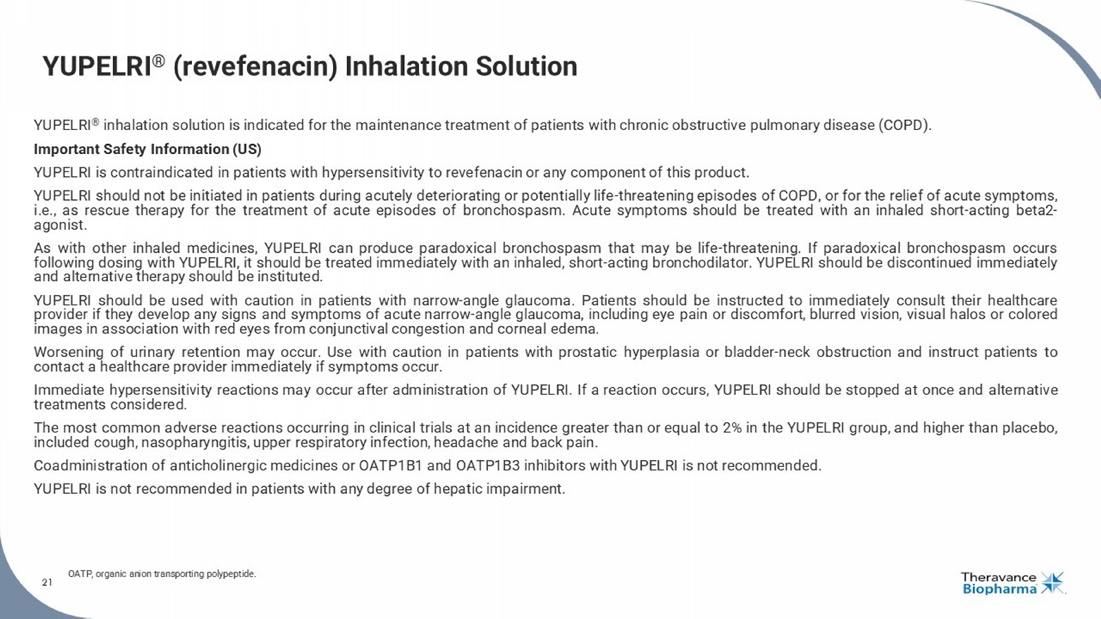 21 YUPELRI ® (revefenacin) Inhalation Solution YUPELRI ® inhalation solution is indicated for the maintenance treatment of patients with chronic obstructive pulmonary disease (COPD) . Important Safety Information (US) YUPELRI is contraindicated in patients with hypersensitivity to revefenacin or any component of this product . YUPELRI should not be initiated in patients during acutely deteriorating or potentially life - threatening episodes of COPD, or for the relief of acute symptoms, i . e . , as rescue therapy for the treatment of acute episodes of bronchospasm . Acute symptoms should be treated with an inhaled short - acting beta 2 - agonist . As with other inhaled medicines, YUPELRI can produce paradoxical bronchospasm that may be life - threatening . If paradoxical bronchospasm occurs following dosing with YUPELRI, it should be treated immediately with an inhaled, short - acting bronchodilator . YUPELRI should be discontinued immediately and alternative therapy should be instituted . YUPELRI should be used with caution in patients with narrow - angle glaucoma . Patients should be instructed to immediately consult their healthcare provider if they develop any signs and symptoms of acute narrow - angle glaucoma, including eye pain or discomfort, blurred vision, visual halos or colored images in association with red eyes from conjunctival congestion and corneal edema . Worsening of urinary retention may occur . Use with caution in patients with prostatic hyperplasia or bladder - neck obstruction and instruct patients to contact a healthcare provider immediately if symptoms occur . Immediate hypersensitivity reactions may occur after administration of YUPELRI . If a reaction occurs, YUPELRI should be stopped at once and alternative treatments considered . The most common adverse reactions occurring in clinical trials at an incidence greater than or equal to 2 % in the YUPELRI group, and higher than placebo, included cough, nasopharyngitis, upper respiratory infection, headache and back pain . Coadministration of anticholinergic medicines or OATP 1 B 1 and OATP 1 B 3 inhibitors with YUPELRI is not recommended . YUPELRI is not recommended in patients with any degree of hepatic impairment . OATP, organic anion transporting polypeptide. 21