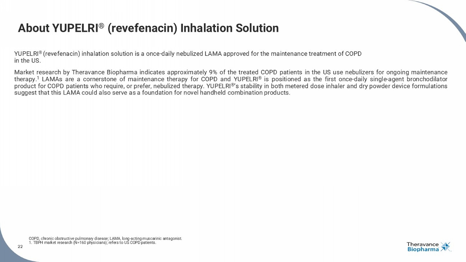 22 About YUPELRI ® (revefenacin) Inhalation Solution YUPELRI ® ( revefenacin ) inhalation solution is a once - daily nebulized LAMA approved for the maintenance treatment of COPD in the US . Market research by Theravance Biopharma indicates approximately 9 % of the treated COPD patients in the US use nebulizers for ongoing maintenance therapy . 1 LAMAs are a cornerstone of maintenance therapy for COPD and YUPELRI ® is positioned as the first once - daily single - agent bronchodilator product for COPD patients who require, or prefer, nebulized therapy . YUPELRI ® ’s stability in both metered dose inhaler and dry powder device formulations suggest that this LAMA could also serve as a foundation for novel handheld combination products . COPD, chronic obstructive pulmonary disease; LAMA, long - acting muscarinic antagonist. 1. TBPH market research (N=160 physicians); refers to US COPD patients. 22