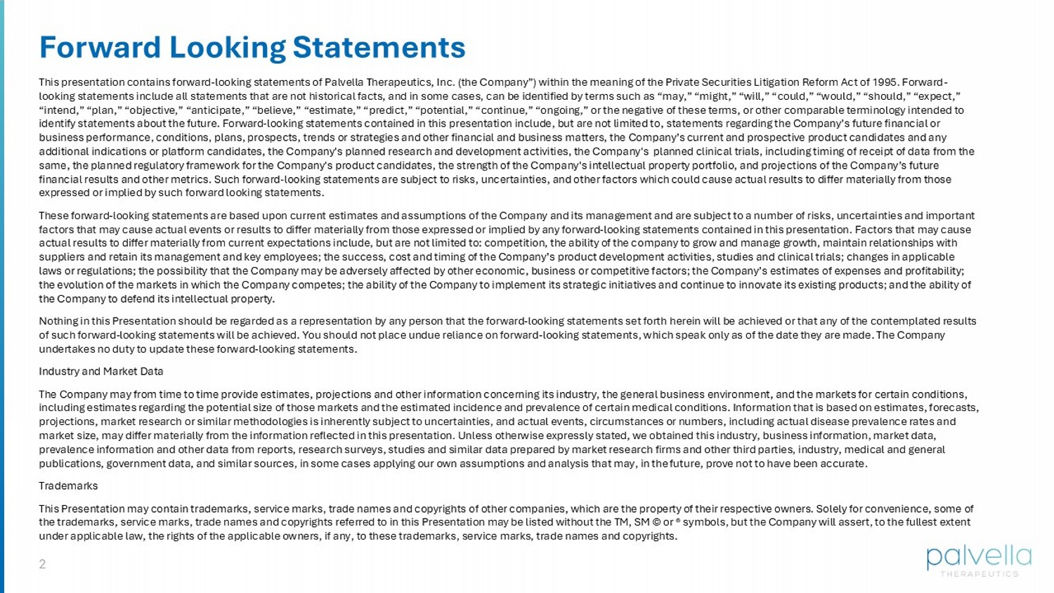 2 Forward Looking Statements This presentation contains forward - looking statements of Palvella Therapeutics, Inc. (the Company”) within the meaning of the Pr ivate Securities Litigation Reform Act of 1995. Forward - looking statements include all statements that are not historical facts, and in some cases, can be identified by terms such a s “ may,” “might,” “will,” “could,” “would,” “should,” “expect,” “intend,” “plan,” “objective,” “anticipate,” “believe,” “estimate,” “predict,” “potential,” “continue,” “ongoing,” or the neg ati ve of these terms, or other comparable terminology intended to identify statements about the future. Forward - looking statements contained in this presentation include, but are not limited to, statements regarding the Company’s future financial or business performance, conditions, plans, prospects, trends or strategies and other financial and business matters, the Compan y’s current and prospective product candidates and any additional indications or platform candidates, the Company's planned research and development activities, the Company's plan ned clinical trials, including timing of receipt of data from the same, the planned regulatory framework for the Company's product candidates, the strength of the Company's intellectual prope rty portfolio, and projections of the Company’s future financial results and other metrics. Such forward - looking statements are subject to risks, uncertainties, and other factors which could cause actual results to differ materially from those expressed or implied by such forward looking statements. These forward - looking statements are based upon current estimates and assumptions of the Company and its management and are subj ect to a number of risks, uncertainties and important factors that may cause actual events or results to differ materially from those expressed or implied by any forward - looking stat ements contained in this presentation. Factors that may cause actual results to differ materially from current expectations include, but are not limited to: competition, the ability of th e c ompany to grow and manage growth, maintain relationships with suppliers and retain its management and key employees; the success, cost and timing of the Company’s product development acti vit ies, studies and clinical trials; changes in applicable laws or regulations; the possibility that the Company may be adversely affected by other economic, business or competitive fa cto rs; the Company’s estimates of expenses and profitability; the evolution of the markets in which the Company competes; the ability of the Company to implement its strategic initiatives an d continue to innovate its existing products; and the ability of the Company to defend its intellectual property. Nothing in this Presentation should be regarded as a representation by any person that the forward - looking statements set forth herein will be achieved or that any of the contemplated results of such forward - looking statements will be achieved. You should not place undue reliance on forward - looking statements, which sp eak only as of the date they are made. The Company undertakes no duty to update these forward - looking statements. Industry and Market Data The Company may from time to time provide estimates, projections and other information concerning its industry, the general b usi ness environment, and the markets for certain conditions, including estimates regarding the potential size of those markets and the estimated incidence and prevalence of certain medic al conditions. Information that is based on estimates, forecasts, projections, market research or similar methodologies is inherently subject to uncertainties, and actual events, circumstance s o r numbers, including actual disease prevalence rates and market size, may differ materially from the information reflected in this presentation. Unless otherwise expressly stated, we ob tained this industry, business information, market data, prevalence information and other data from reports, research surveys, studies and similar data prepared by market research fi rms and other third parties, industry, medical and general publications, government data, and similar sources, in some cases applying our own assumptions and analysis that may, in the fut ure, prove not to have been accurate. Trademarks This Presentation may contain trademarks, service marks, trade names and copyrights of other companies, which are the propert y o f their respective owners. Solely for convenience, some of the trademarks, service marks, trade names and copyrights referred to in this Presentation may be listed without the TM, SM © or ® symbols, but the Company will assert, to the fullest extent under applicable law, the rights of the applicable owners, if any, to these trademarks, service marks, trade names and copyri ght s.