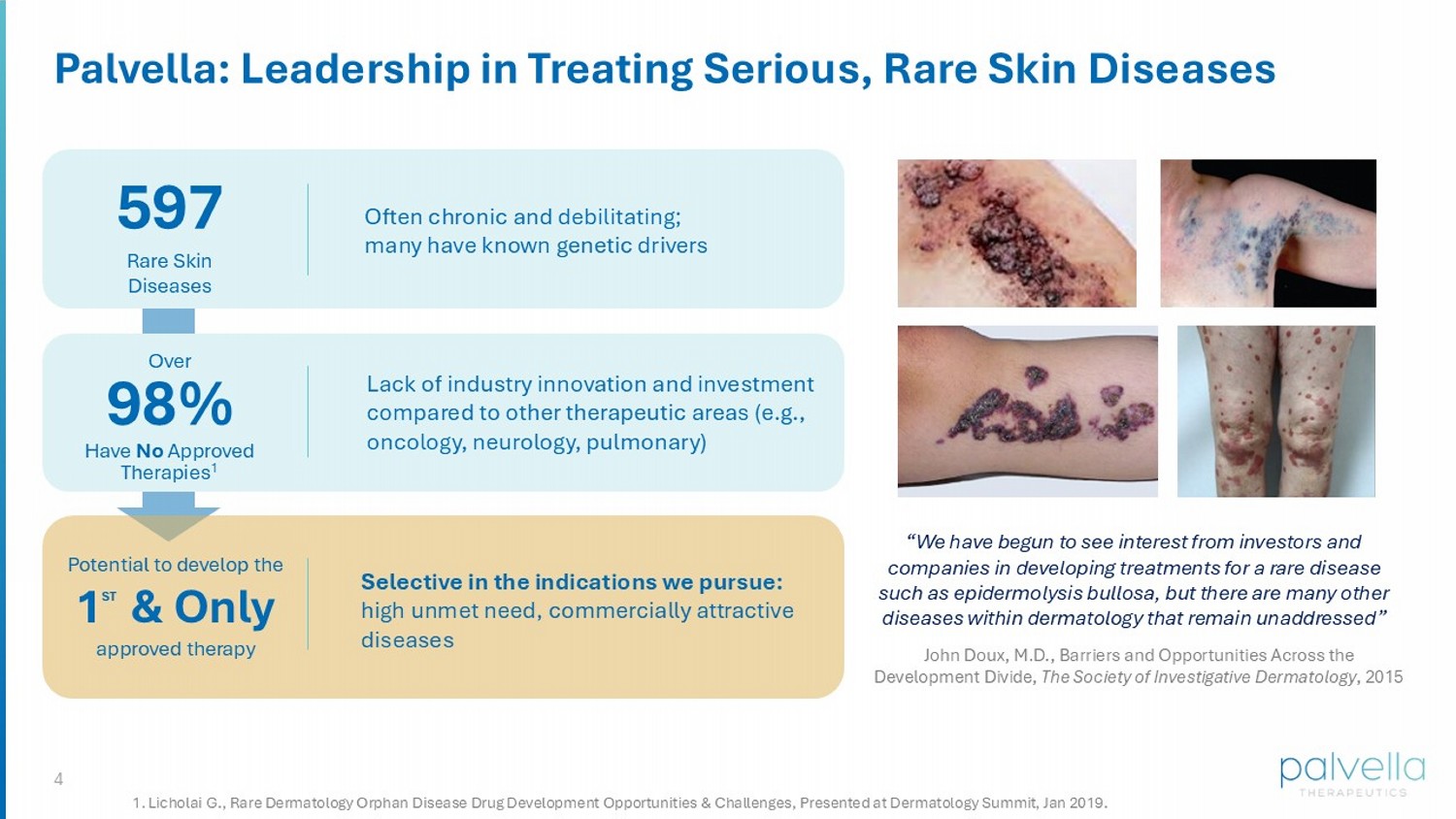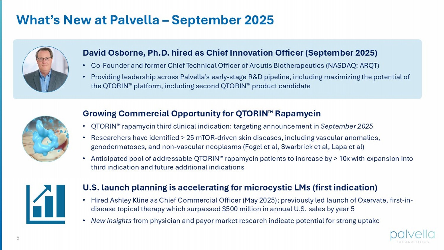 4 Palvella: Leadership in Treating Serious, Rare Skin Diseases 597 Rare Skin Diseases Often chronic and debilitating; many have known genetic drivers Over 98% Have No Approved Therapies 1 Lack of industry innovation and investment compared to other therapeutic areas (e.g., oncology, neurology, pulmonary) Selective in the indications we pursue: high unmet need, commercially attractive diseases Potential to develop the 1 ST & Only approved therapy 1. Licholai G., Rare Dermatology Orphan Disease Drug Development Opportunities & Challenges, Presented at Dermatology Summit, Jan 2019. “We have begun to see interest from investors and companies in developing treatments for a rare disease such as epidermolysis bullosa, but there are many other diseases within dermatology that remain unaddressed” John Doux, M.D., Barriers and Opportunities Across the Development Divide, The Society of Investigative Dermatology , 2015