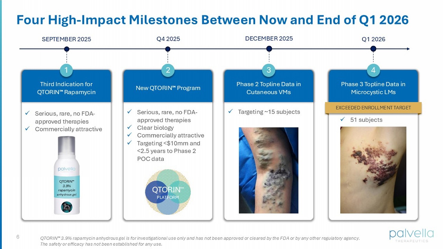 5 What’s New at Palvella – September 2025 U.S. launch planning is accelerating for microcystic LMs (first indication) • Hired Ashley Kline as Chief Commercial Officer (May 2025); previously led launch of Oxervate , first - in - disease topical therapy which surpassed $500 million in annual U.S. sales by year 5 • New insights from physician and payor market research indicate potential for strong uptake David Osborne, Ph.D. hired as Chief Innovation Officer (September 2025) • Co - Founder and former Chief Technical Officer of Arcutis Biotherapeutics (NASDAQ: ARQT) • Providing leadership across Palvella’s early - stage R&D pipeline, including maximizing the potential of the QTORIN platform, including second QTORIN product candidate Growing Commercial Opportunity for QTORIN Rapamycin • QTORIN rapamycin third clinical indication: targeting announcement in September 2025 • Researchers have identified > 25 mTOR - driven skin diseases, including vascular anomalies, genodermatoses, and non - vascular neoplasms (Fogel et al, Swarbrick et al, Lapa et al) • Anticipated pool of addressable QTORIN rapamycin patients to increase by > 10x with expansion into third indication and future additional indications
