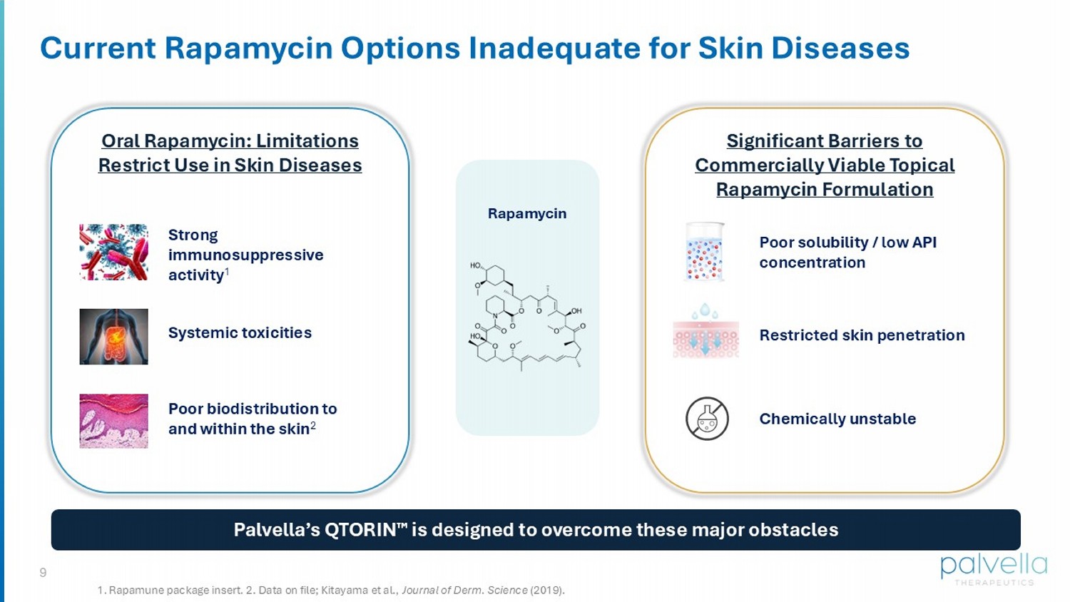 8 HIGH DRUG LOADING CAPACITY High solubility → high concentrations → potential for rapid onset and large magnitude treatment effect SAFETY AND TOLERABILITY Retaining active drug in the skin while minimizing systemic absorption DERMAL ENGAGEMENT Delivery to deeper layers of skin, often the site of disease pathophysiology IP Each QTORIN TM product candidate eligible for composition IP on formulation QTORIN : Reproducible Platform for Generating Novel, Topical Product Candidates in a Capital Efficient Manner QTORIN TM PLATFORM