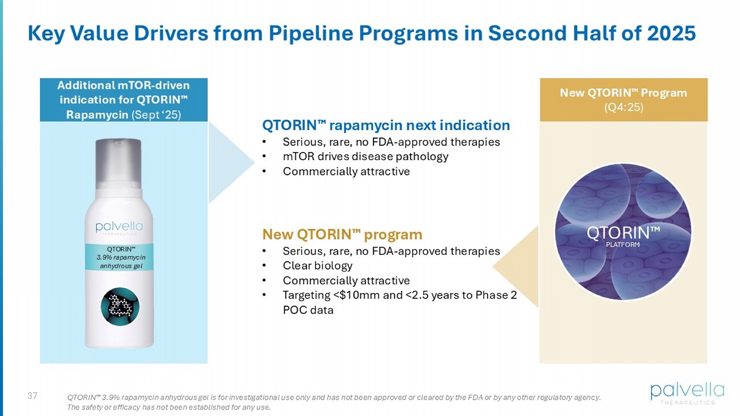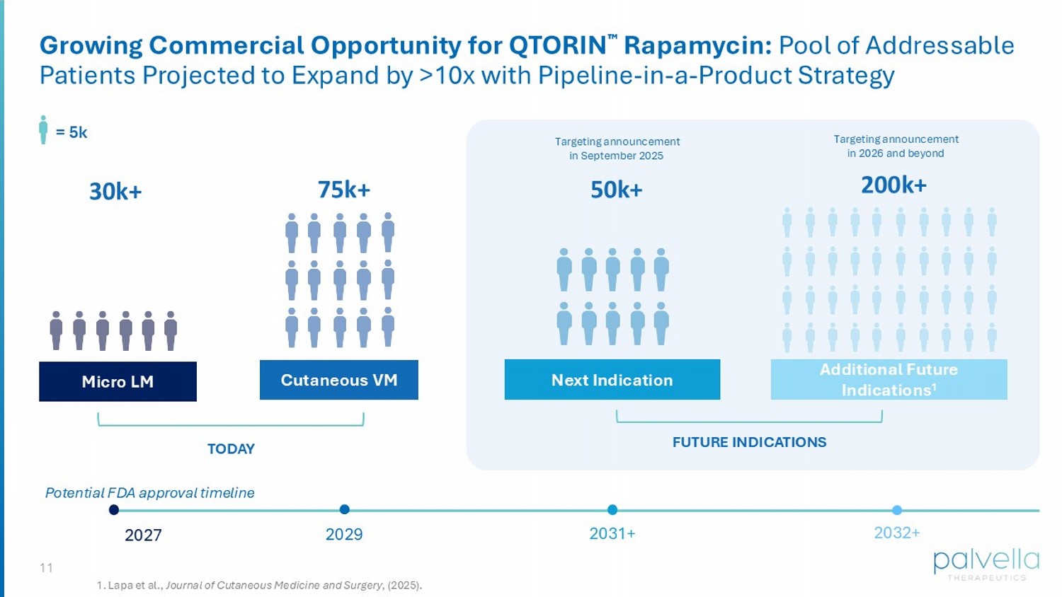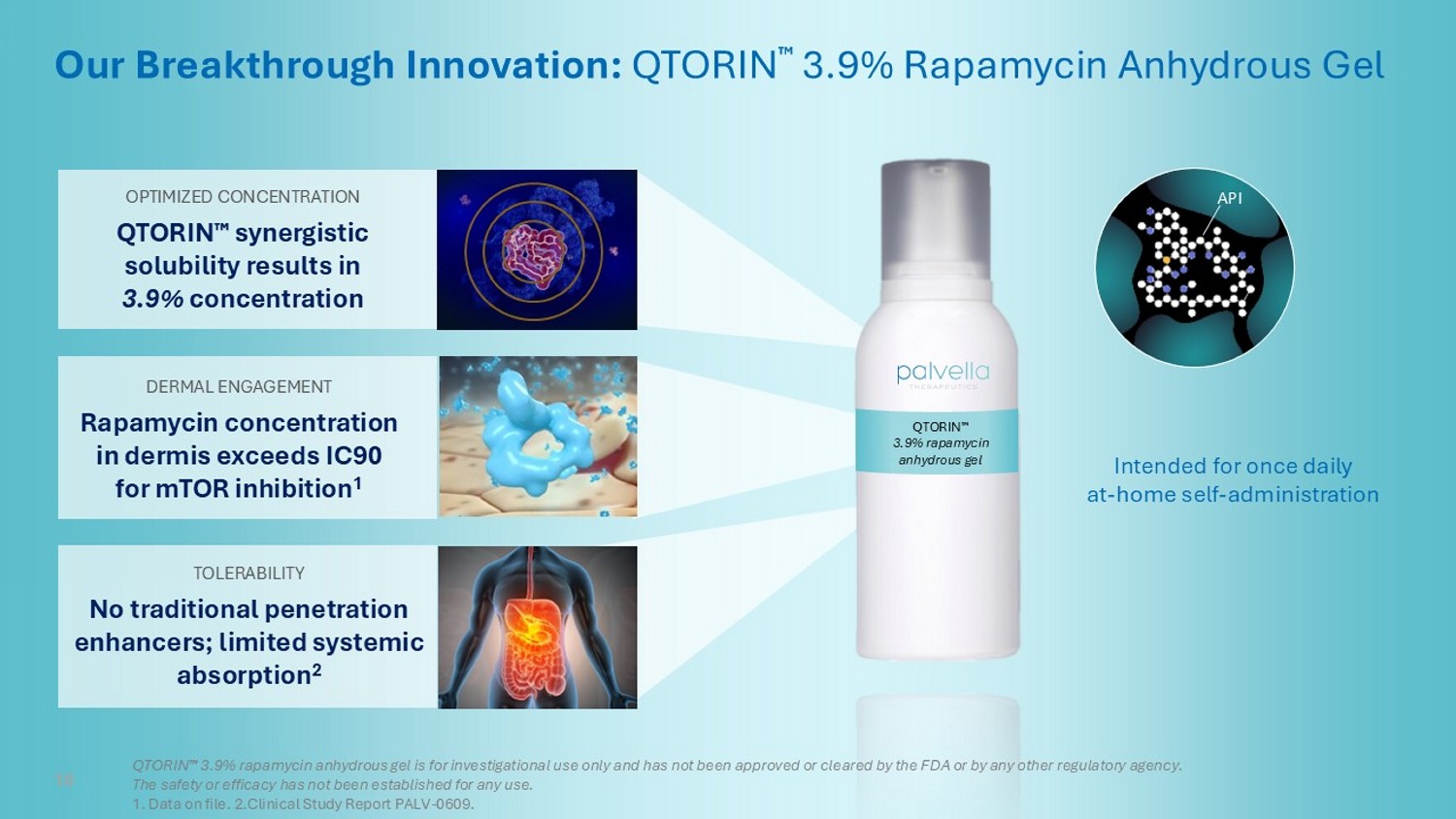 10 QTORIN 3.9% rapamycin anhydrous gel Our Breakthrough Innovation: QTORIN 3.9% Rapamycin Anhydrous Gel DERMAL ENGAGEMENT Rapamycin concentration in dermis exceeds IC90 for mTOR inhibition 1 OPTIMIZED CONCENTRATION QTORIN synergistic solubility results in 3.9% concentration TOLERABILITY No traditional penetration enhancers; limited systemic absorption 2 Intended for once daily at - home self - administration 10 QTORIN 3.9% rapamycin anhydrous gel is for investigational use only and has not been approved or cleared by the FDA or by any other regulatory agency. The safety or efficacy has not been established for any use. 1. Data on file. 2.Clinical Study Report PALV - 0609. API