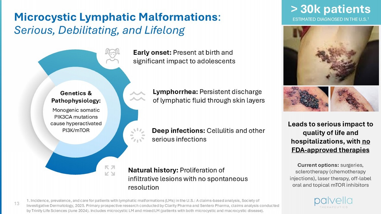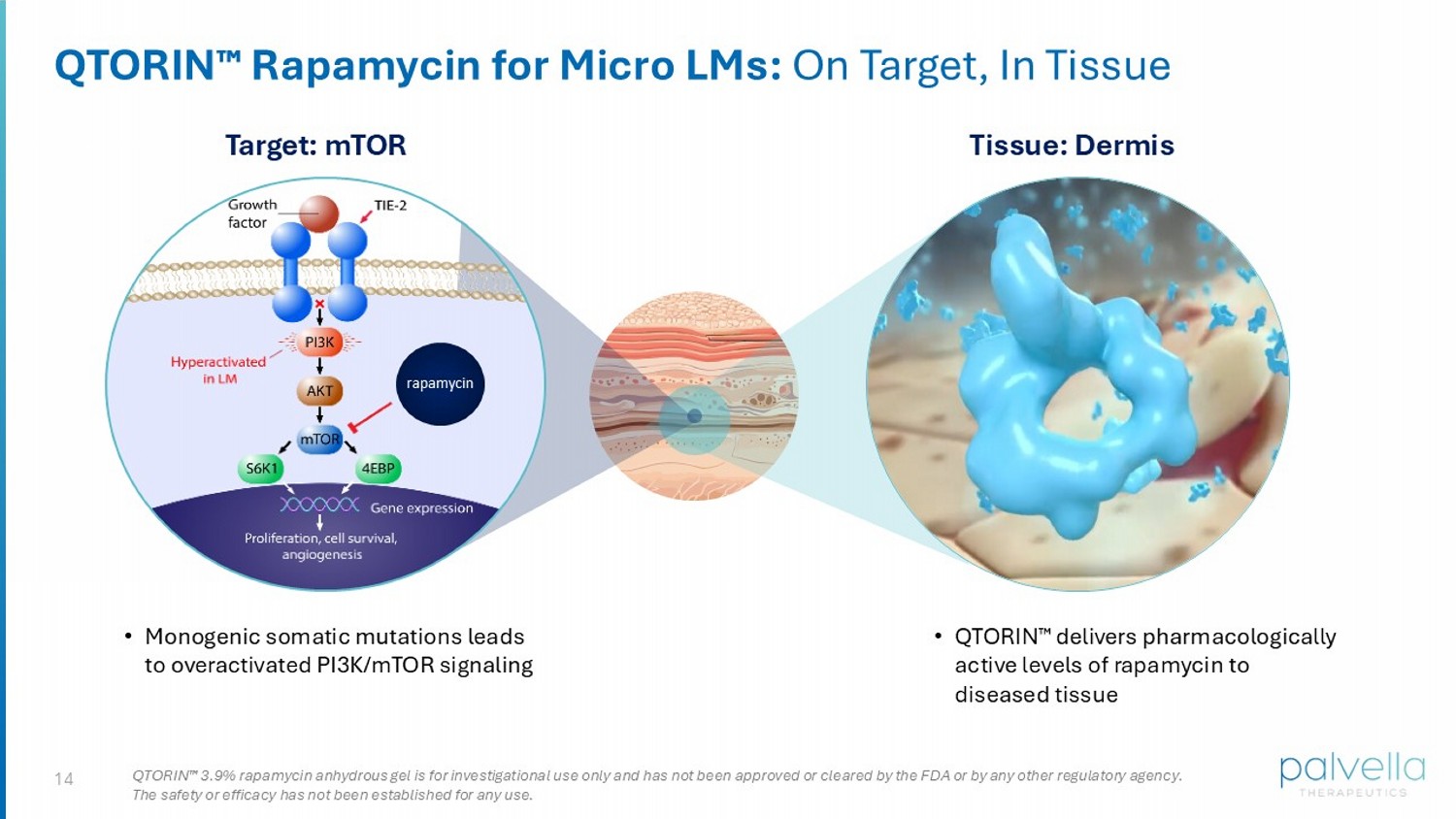 13 Microcystic Lymphatic Malformations : Serious, Debilitating, and Lifelong Genetics & Pathophysiology: Monogenic somatic PIK3CA mutations cause hyperactivated PI3K/mTOR Lymphorrhea : Persistent discharge of lymphatic fluid through skin layers Deep infections: Cellulitis and other serious infections Natural history: Proliferation of infiltrative lesions with no spontaneous resolution Leads to serious impact to quality of life and hospitalizations, with no FDA - approved therapies Current options: surgeries, sclerotherapy (chemotherapy injections), laser therapy, off - label oral and topical mTOR inhibitors > 30k patients ESTIMATED DIAGNOSED IN THE U.S. 1 Early onset: Present at birth and significant impact to adolescents 1. Incidence, prevalence, and care for patients with lymphatic malformations (LMs) in the U.S.: A claims - based analysis, Society of Investigative Dermatology, 2025. Primary prospective research conducted by Clarity Pharma and Sentero Pharma, claims analysis co nducted by Trinity Life Sciences (June 2024). Includes microcystic LM and mixed LM (patients with both microcystic and macrocystic di sea se).