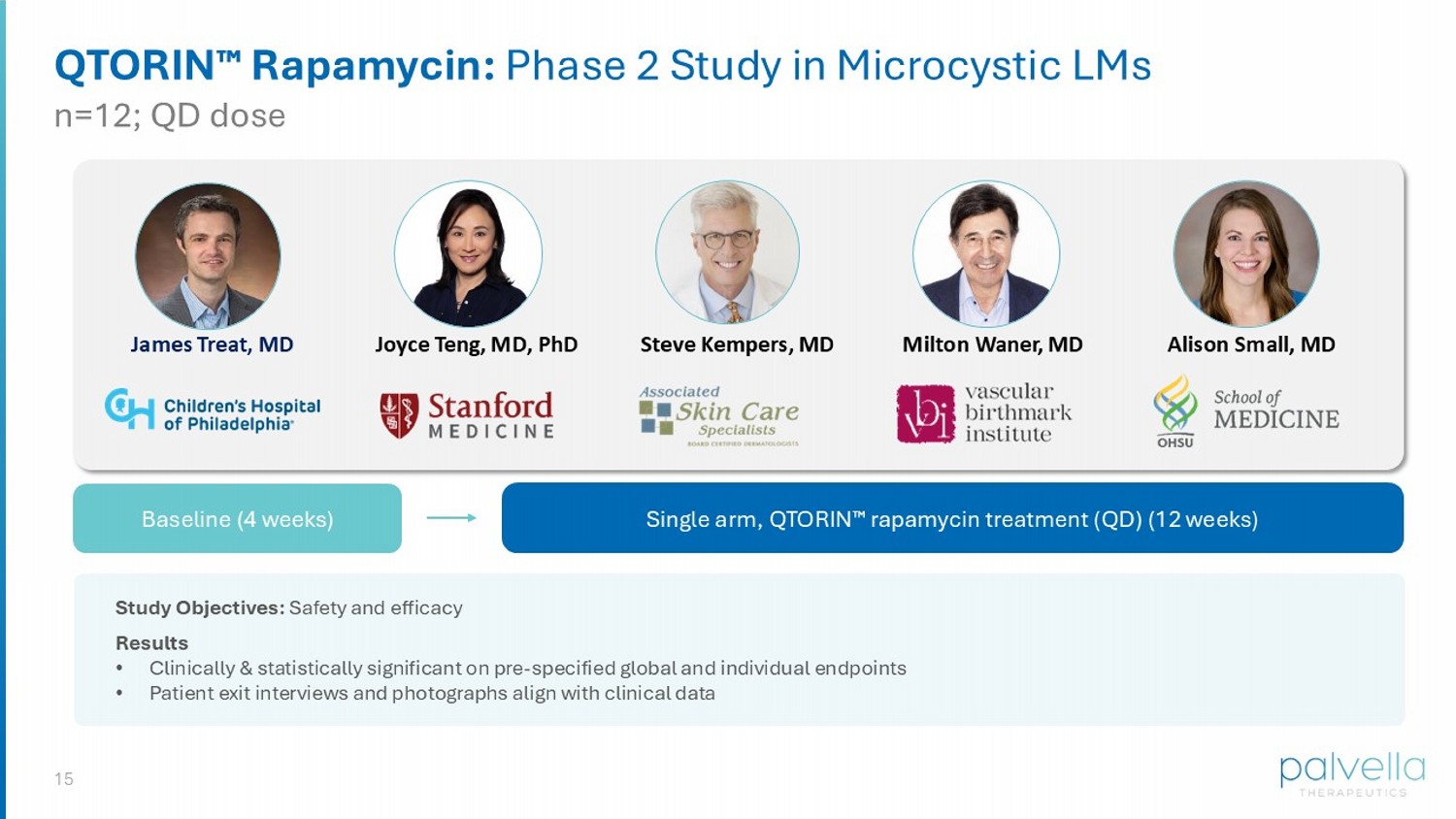 14 QTORIN Rapamycin for Micro LMs: On Target, In Tissue rapamycin Target: mTOR Tissue: Dermis • Monogenic somatic mutations leads to overactivated PI3K/mTOR signaling • QTORIN delivers pharmacologically active levels of rapamycin to diseased tissue QTORIN 3.9% rapamycin anhydrous gel is for investigational use only and has not been approved or cleared by the FDA or by any other regulatory agency. The safety or efficacy has not been established for any use.