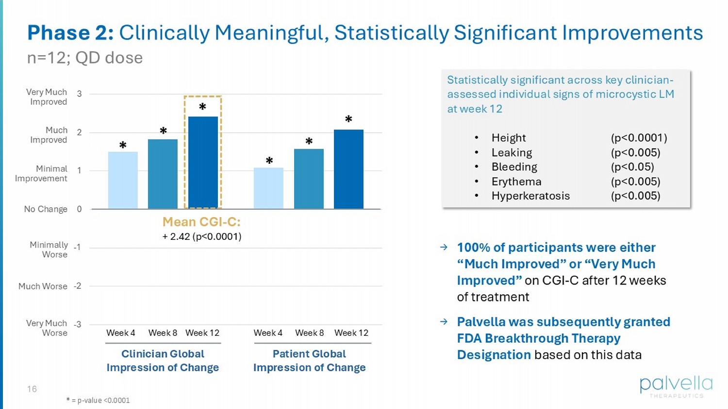 15 QTORIN Rapamycin: Phase 2 Study in Microcystic LMs n=12; QD dose James Treat, MD Joyce Teng, MD, PhD Alison Small, MD Milton Waner, MD Steve Kempers , MD Single arm, QTORIN rapamycin treatment (QD) (12 weeks) Baseline ( 4 weeks ) Study Objectives: Safety and efficacy Results • Clinically & statistically significant on pre - specified global and individual endpoints • Patient exit interviews and photographs align with clinical data