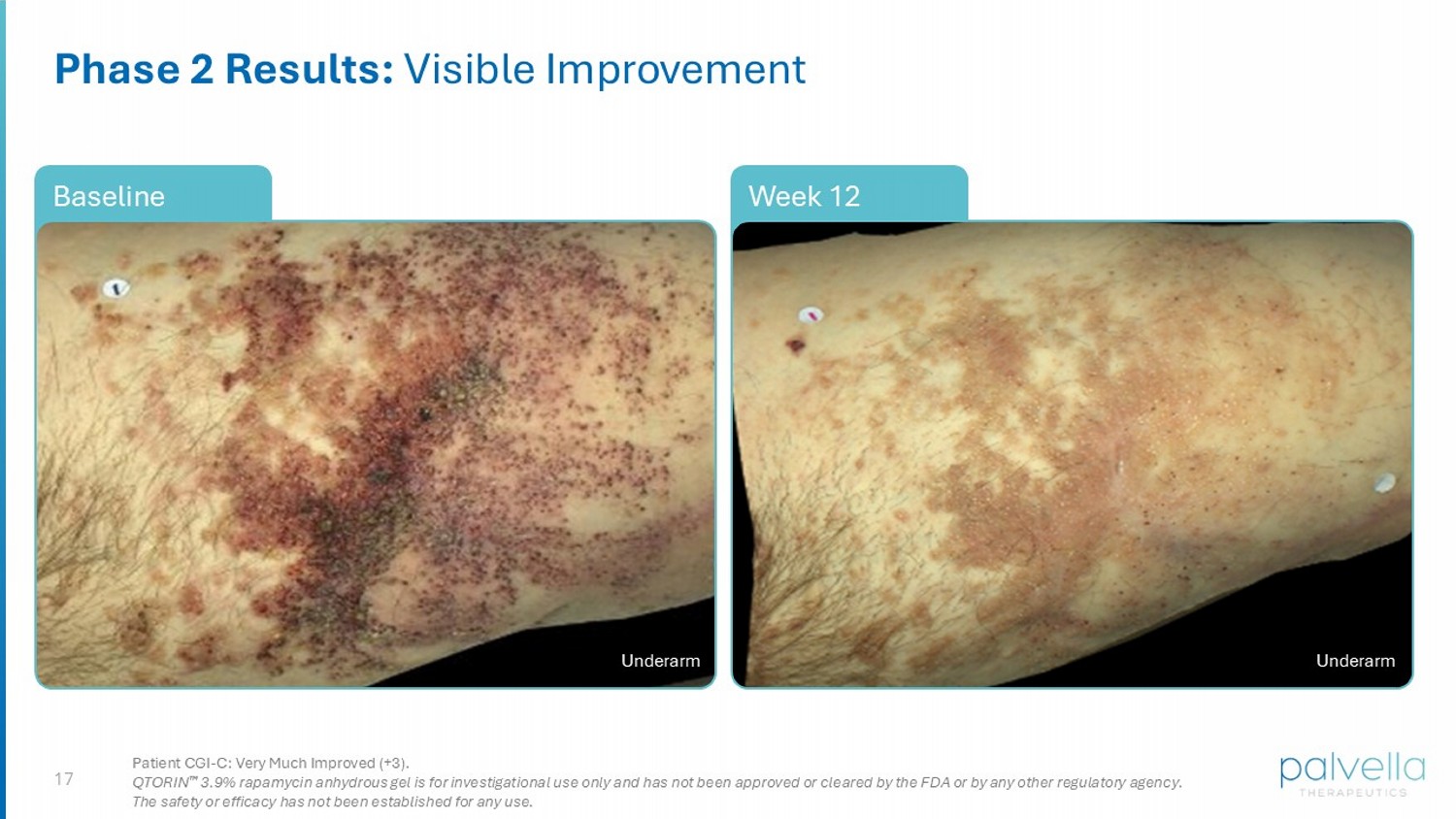 17 Week 12 Phase 2 Results: Visible Improvement Baseline Patient CGI - C: Very Much Improved (+3). QTORIN 3.9% rapamycin anhydrous gel is for investigational use only and has not been approved or cleared by the FDA or by any other regulatory agency. The safety or efficacy has not been established for any use. Underarm Underarm