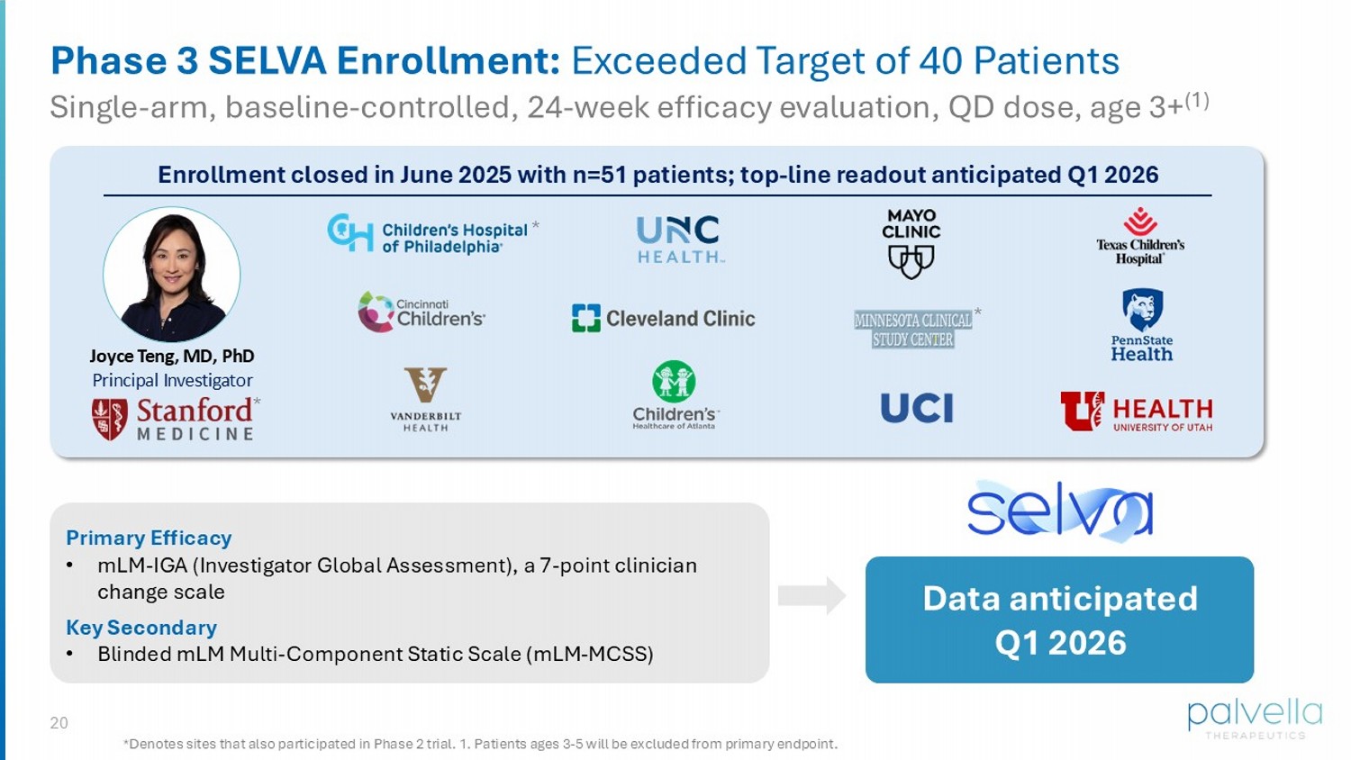 20 Phase 3 SELVA Enrollment: Exceeded Target of 40 Patients Single - arm, baseline - controlled, 24 - week efficacy evaluation, QD dose, age 3+ (1) *Denotes sites that also participated in Phase 2 trial . 1. Patients ages 3 - 5 will be excluded from primary endpoint. Enrollment closed in June 2025 with n=51 patients; t op - line readout anticipated Q1 2026 Joyce Teng, MD, PhD Principal Investigator * * * Primary Efficacy • mLM - IGA (Investigator Global Assessment), a 7 - point clinician change scale Key Secondary • Blinded mLM Multi - Component Static Scale (mLM - MCSS) Data anticipated Q1 2026
