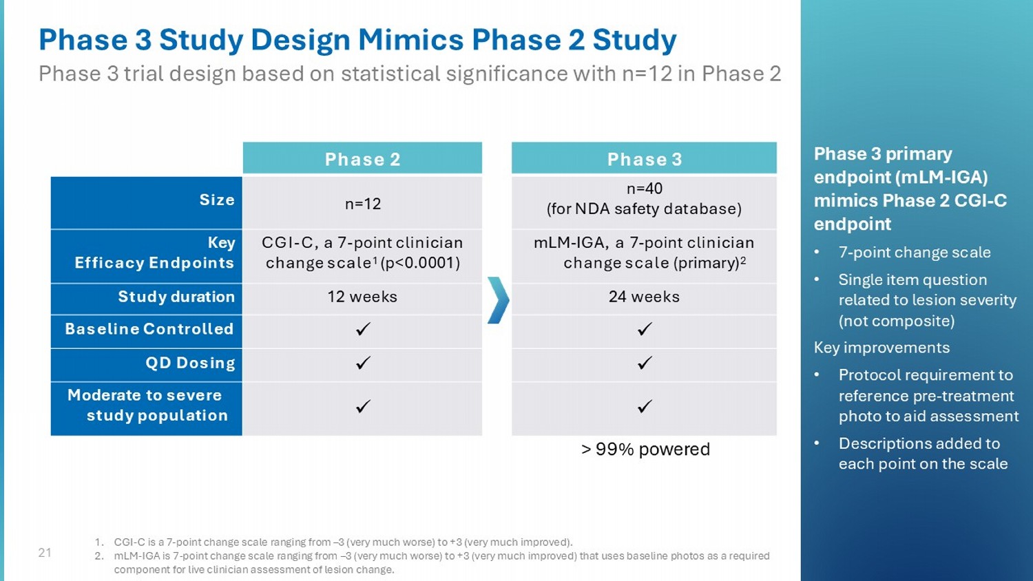 21 Phase 3 Study Design Mimics Phase 2 Study Phase 3 trial design based on statistical significance with n=12 in Phase 2 Phase 2 n=12 Size CGI - C, a 7 - point clinician change scale 1 (p<0.0001) Key Efficacy Endpoints 12 weeks Study duration x Baseline Controlled x QD Dosing x Moderate to severe study population Phase 3 n=40 (for NDA safety database) mLM - IGA, a 7 - point clinician change scale (primary) 2 24 weeks x x x > 99% powered Phase 3 primary endpoint (mLM - IGA) mimics Phase 2 CGI - C endpoint • 7 - point change scale • Single item question related to lesion severity (not composite) Key improvements • Protocol requirement to reference pre - treatment photo to aid assessment • Descriptions added to each point on the scale 1. CGI - C is a 7 - point change scale ranging from – 3 (very much worse) to +3 (very much improved). 2. mLM - IGA is 7 - point change scale ranging from – 3 (very much worse) to +3 (very much improved) that uses baseline photos as a require d component for live clinician assessment of lesion change.