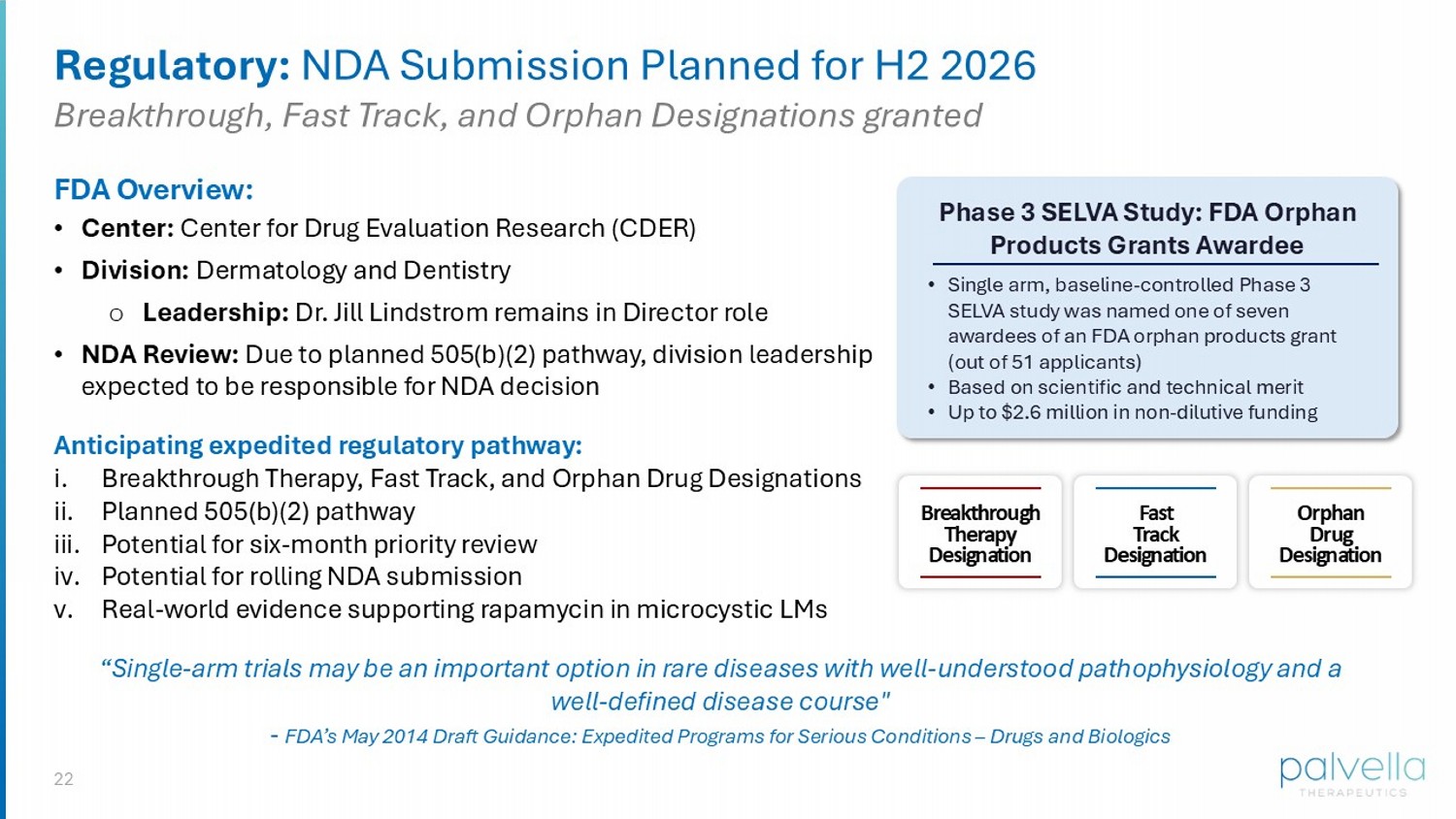 22 Regulatory: NDA Submission Planned for H2 2026 Breakthrough, Fast Track, and Orphan Designations granted Anticipating expedited regulatory pathway: i. Breakthrough Therapy, Fast Track, and Orphan Drug Designations ii. Planned 505(b)(2) pathway iii. Potential for six - month priority review iv. Potential for rolling NDA submission v. Real - world evidence supporting rapamycin in microcystic LMs Phase 3 SELVA Study: FDA Orphan Products Grants Awardee • Single arm, baseline - controlled Phase 3 SELVA study was named one of seven awardees of an FDA orphan products grant (out of 51 applicants) • Based on scientific and technical merit • Up to $2.6 million in non - dilutive funding FDA Overview: • Center: Center for Drug Evaluation Research (CDER) • Division: Dermatology and Dentistry o Leadership: Dr. Jill Lindstrom remains in Director role • NDA Review: Due to planned 505(b)(2) pathway, division leadership expected to be responsible for NDA decision Breakthrough Therapy Designation Fast Track Designation Orphan Drug Designation “Single - arm trials may be an important option in rare diseases with well - understood pathophysiology and a well - defined disease course" - FDA’s May 2014 Draft Guidance: Expedited Programs for Serious Conditions – Drugs and Biologics
