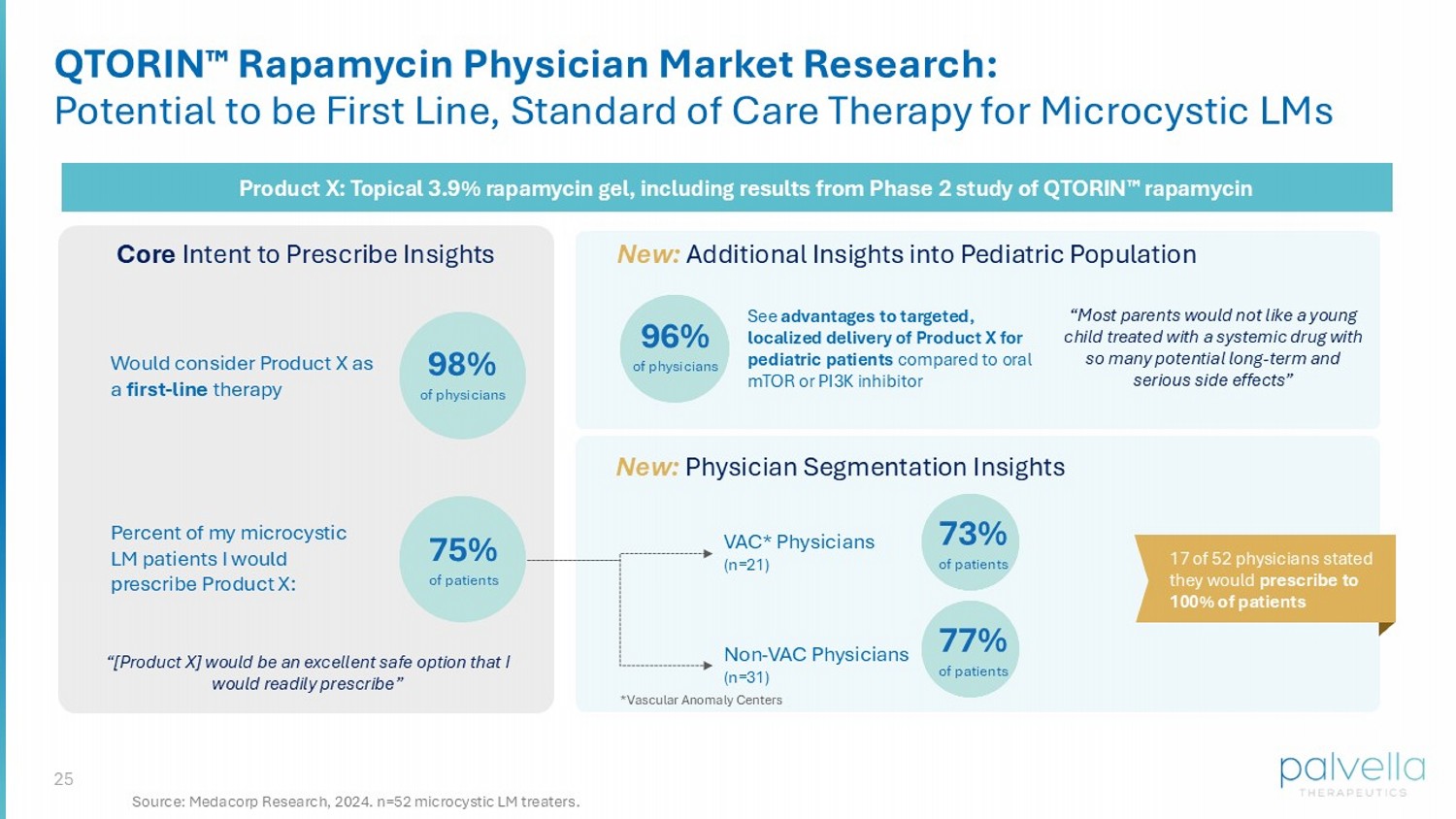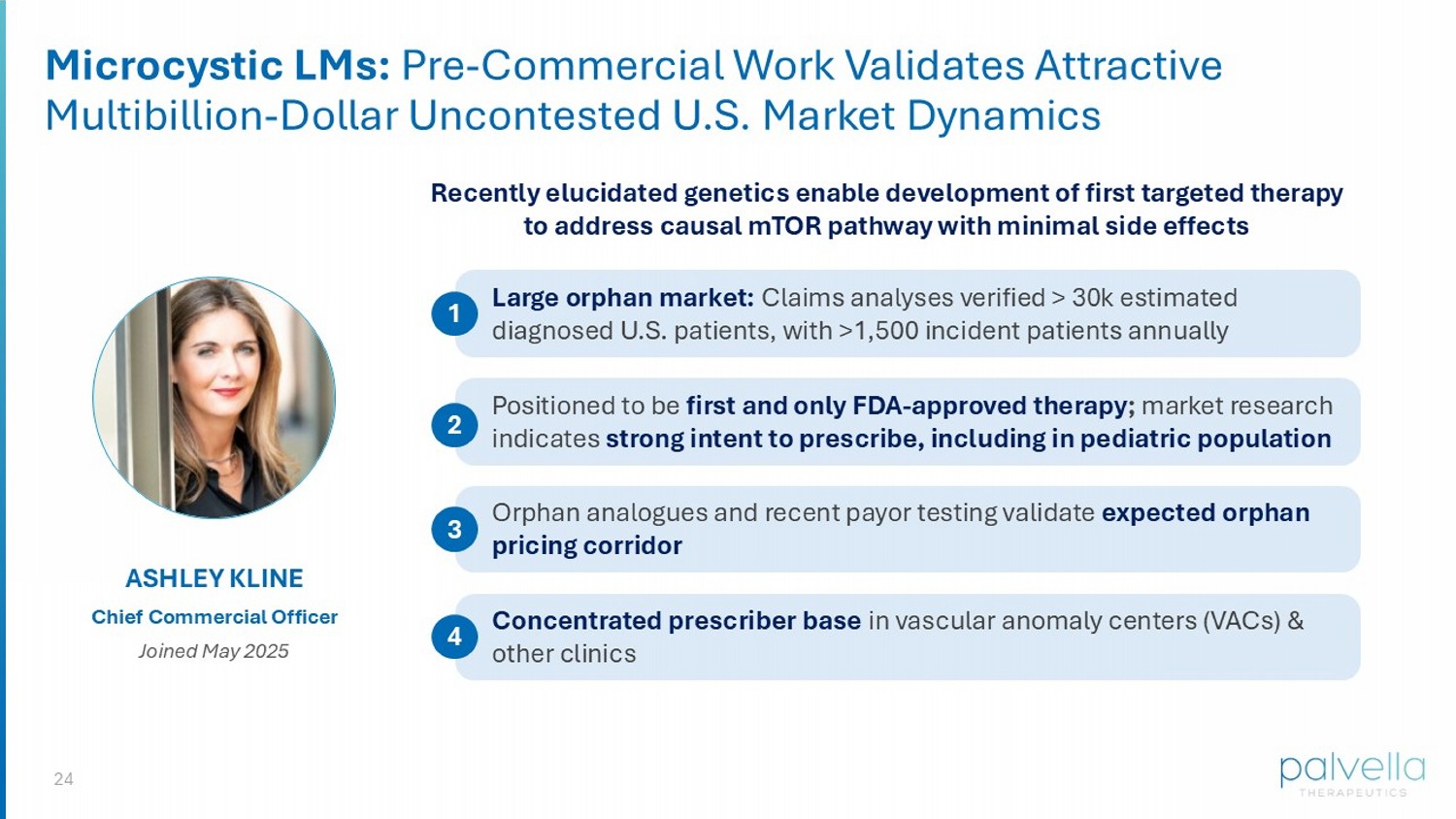 24 Microcystic LMs: Pre - Commercial Work Validates Attractive Multibillion - Dollar Uncontested U.S. Market Dynamics ASHLEY KLINE Chief Commercial Officer Joined May 2025 Recently elucidated genetics enable development of first targeted therapy to address causal mTOR pathway with minimal side effects Large orphan market: Claims analyses verified > 30k estimated diagnosed U.S. patients, with >1,500 incident patients annually 1 Positioned to be first and only FDA - approved therapy ; market research indicates strong intent to prescribe, including in pediatric population 2 Orphan analogues and recent payor testing validate expected orphan pricing corridor 3 Concentrated prescriber base in vascular anomaly centers (VACs) & other clinics 4