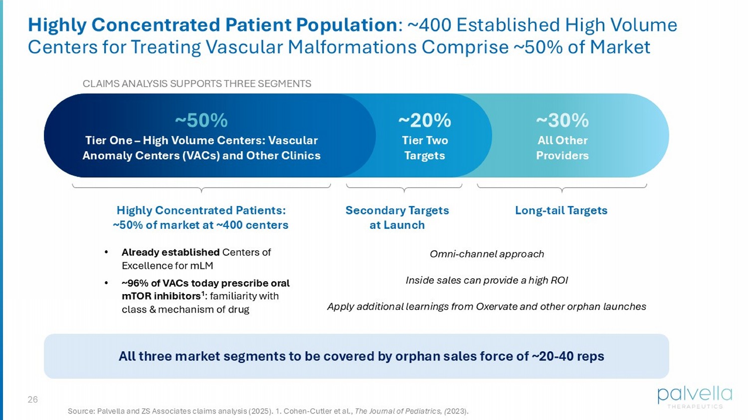 26 Highly Concentrated Patient Population : ~400 Established High Volume Centers for Treating Vascular Malformations Comprise ~50% of Market Source: Palvella and ZS Associates claims analysis (2025). 1. Cohen - Cutler et al., The Journal of Pediatrics, ( 2023). CLAIMS ANALYSIS SUPPORTS THREE SEGMENTS ~50% Tier One – High Volume Centers: Vascular Anomaly Centers (VACs) and Other Clinics • Already established Centers of Excellence for mLM • ~96% of VACs today prescribe oral mTOR inhibitors 1 : familiarity with class & mechanism of drug ~20% Tier Two Targets ~30% All Other Providers Highly Concentrated Patients: ~50% of market at ~400 centers Secondary Targets at Launch Long - tail Targets Omni - channel approach Inside sales can provide a high ROI Apply additional learnings from Oxervate and other orphan launches All three market segments to be covered by orphan sales force of ~20 - 40 reps
