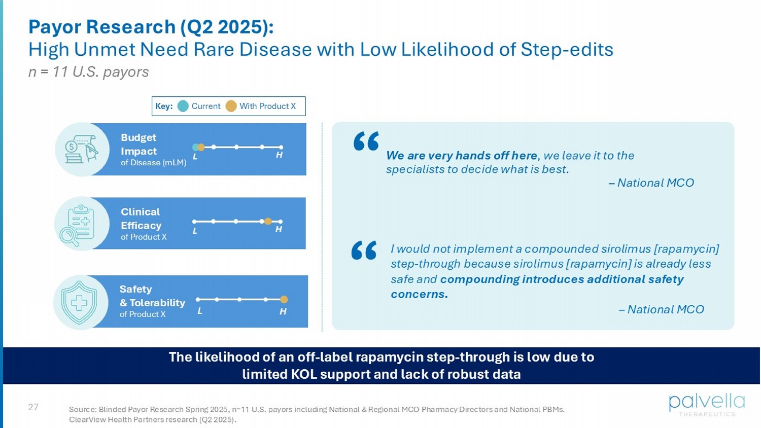 27 Payor Research (Q2 2025): High Unmet Need Rare Disease with Low Likelihood of Step - edits Safety & Tolerability of Product X Clinical Efficacy of Product X L H L H Budget Impact of Disease ( mLM ) L H “ We are very hands off here , we leave it to the specialists to decide what is best. – National MCO I would not implement a compounded sirolimus [rapamycin] step - through because sirolimus [rapamycin] is already less safe and compounding introduces additional safety concerns. – National MCO “ Key: Current With Product X Source: Blinded Payor Research Spring 2025, n=11 U.S. payors including National & Regional MCO Pharmacy Directors and Nationa l P BMs. ClearView Health Partners research (Q2 2025). The likelihood of an off - label rapamycin step - through is low due to limited KOL support and lack of robust data n = 11 U.S. payors