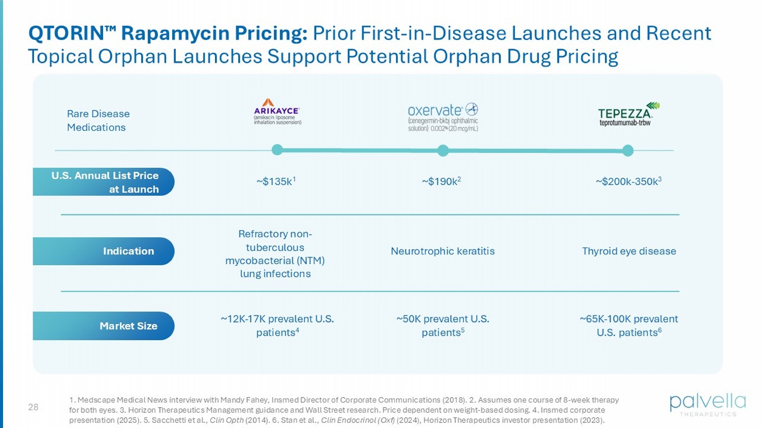 28 1. Medscape Medical News interview with Mandy Fahey, Insmed Director of Corporate Communications (2018). 2 . Assumes one course of 8 - week therapy for both eyes. 3. Horizon Therapeutics Management guidance and Wall Street research. Price dependent on weight - based dosing. 4. Insmed corporate presentation (2025). 5. Sacchetti et al., Clin Opth (2014). 6. Stan et al., Clin Endocrinol ( Oxf ) (2024), Horizon Therapeutics investor presentation (2023). ~$135k 1 Rare Disease Medications Refractory non - tuberculous mycobacterial (NTM) lung infections Thyroid eye disease ~12 K - 17K prevalent U.S. patients 4 ~65K - 100K prevalent U.S. patients 6 ~$200k - 350k 3 Indication Market Size U.S. Annual List Price at Launch QTORIN Rapamycin Pricing: Prior First - in - Disease Launches and Recent Topical Orphan Launches Support Potential Orphan Drug Pricing Neurotrophic keratitis ~50K prevalent U.S. patients 5 ~$190k 2