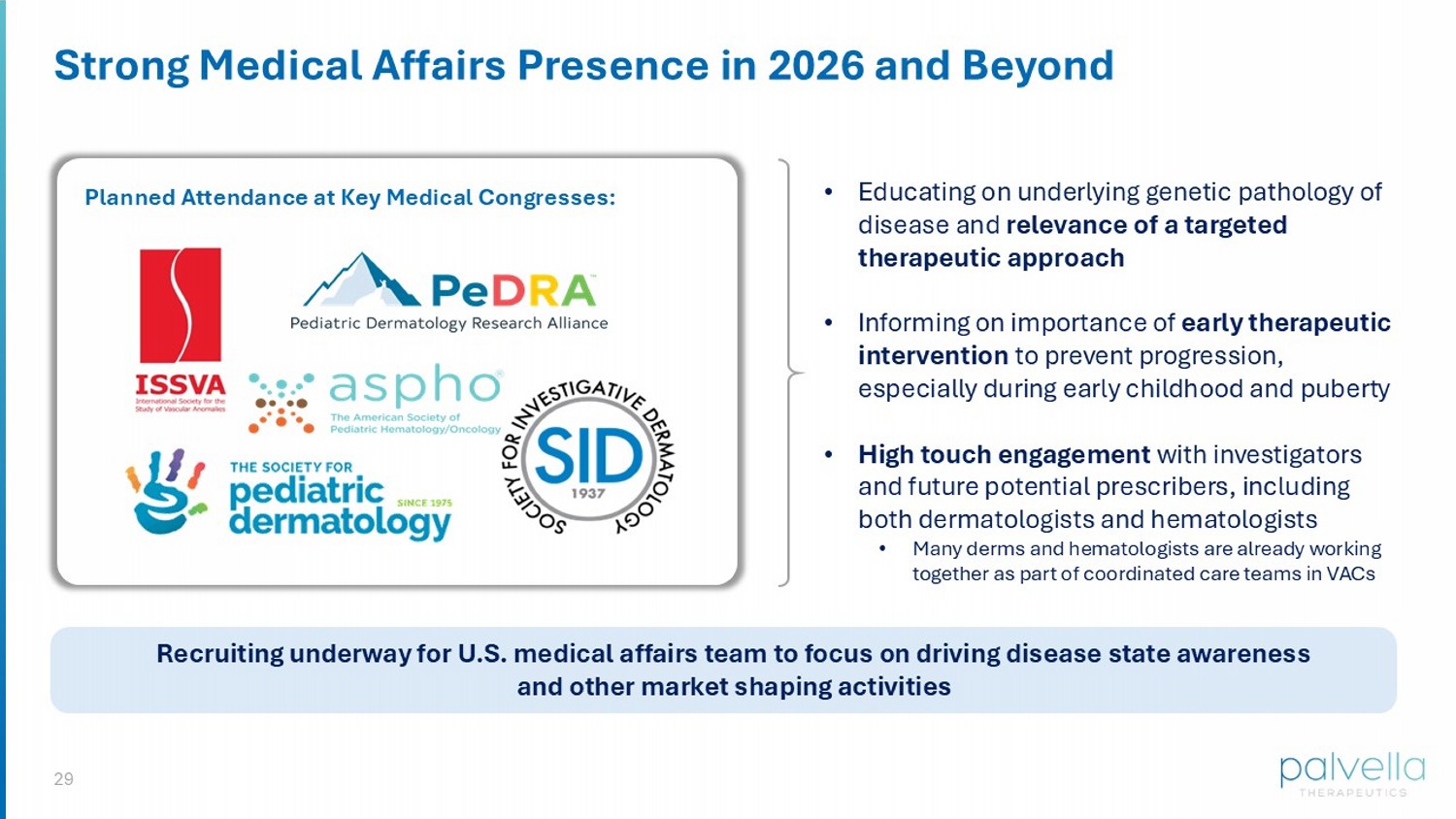 29 Strong Medical Affairs Presence in 2026 and Beyond • Educating on underlying genetic pathology of disease and relevance of a targeted therapeutic approach • Informing on importance of early therapeutic intervention to prevent progression, especially during early childhood and puberty • High touch engagement with investigators and future potential prescribers, including both dermatologists and hematologists • Many derms and hematologists are already working together as part of coordinated care teams in VACs Planned Attendance at Key Medical Congresses: Recruiting underway for U.S. medical affairs team to focus on driving disease state awareness and other market shaping activities